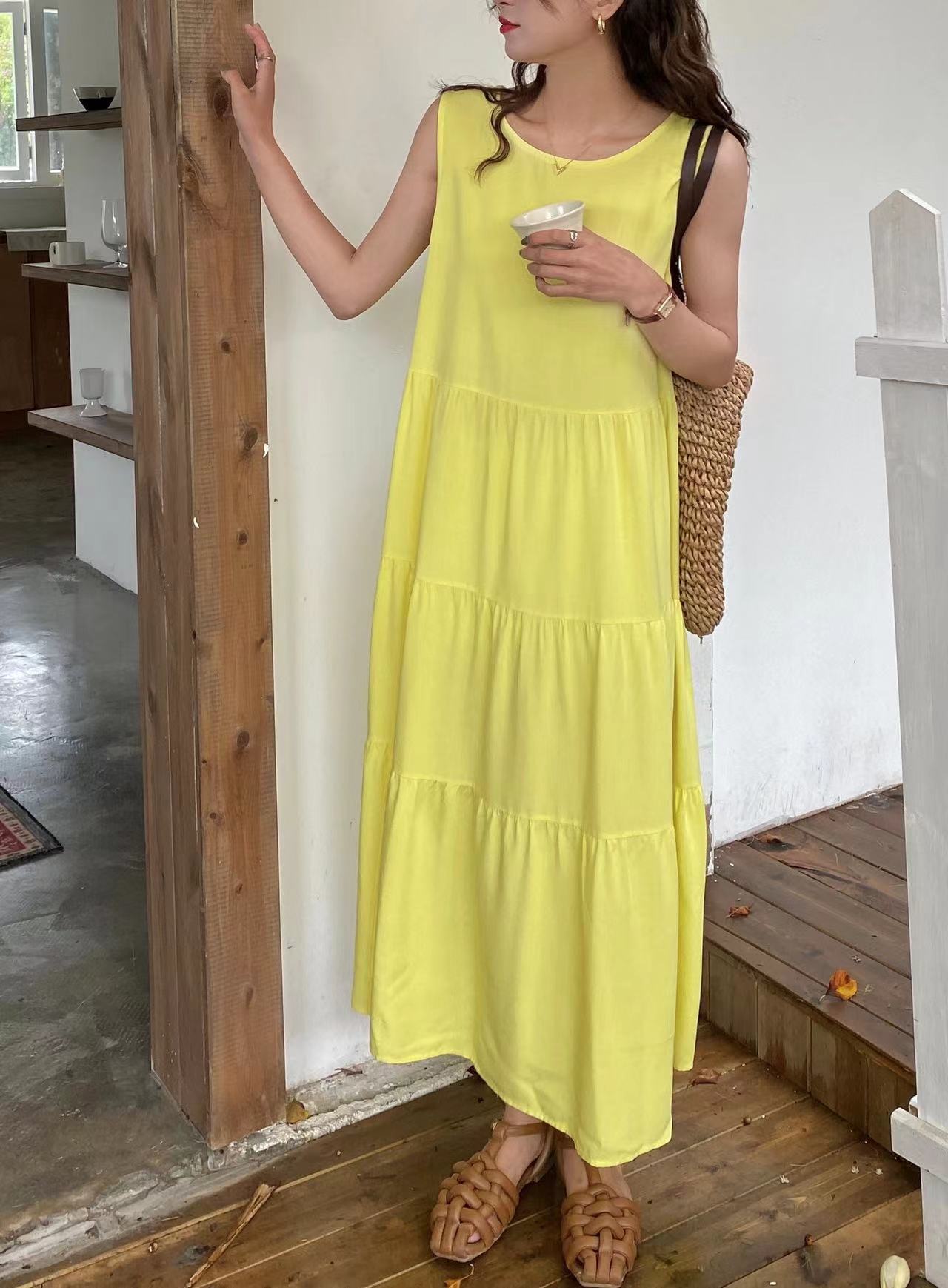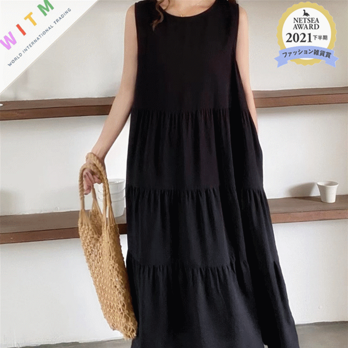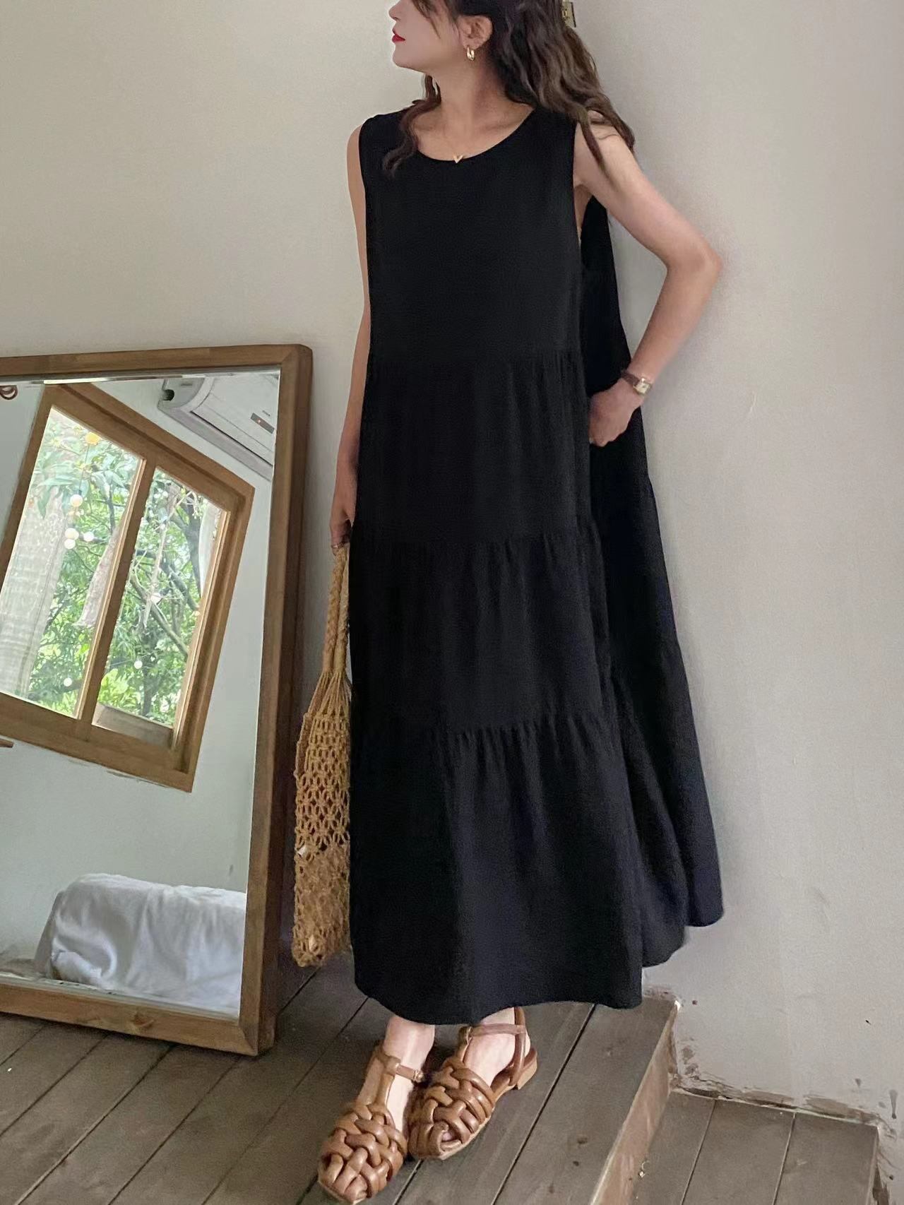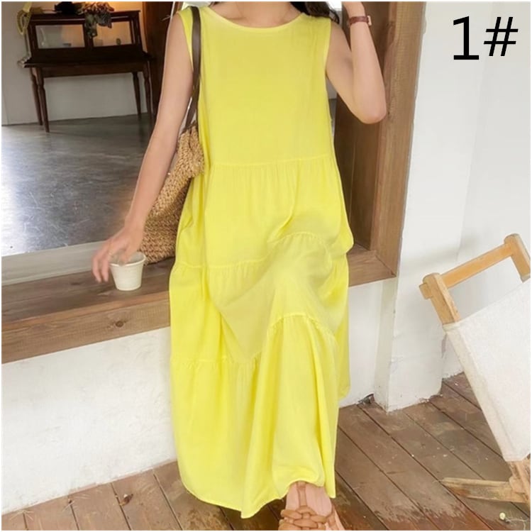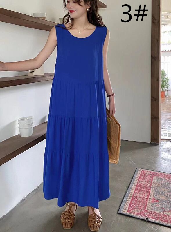◎【送料無料】2022春夏新作 ラウンドネック ロングワンピース ノースリーブ 体型カバー レディース カジュアル