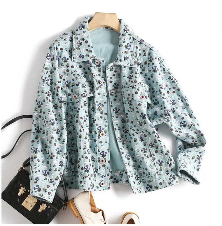 ◎【送料無料】単体ボタンフローラル ショート デニム コート レディース ポロカラー ゆったりする 長袖