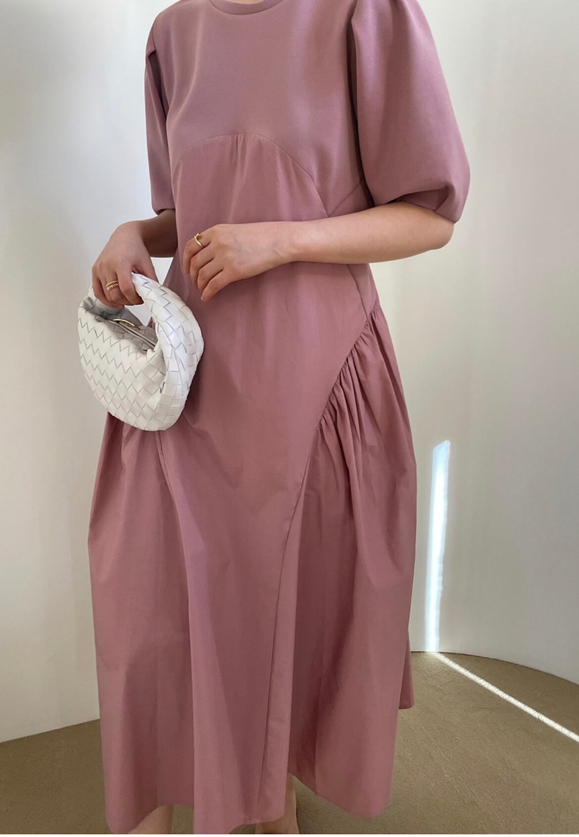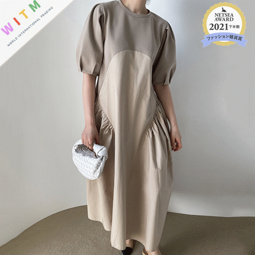 ◎【送料無料】2022春夏新作 韓国風 ロング丈ワンピース ワンピース レディース 体型カバー パフスリーブ 切替