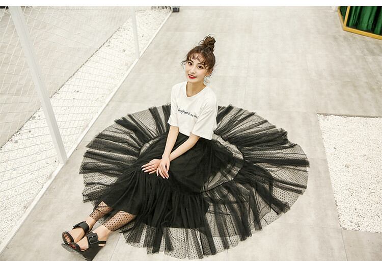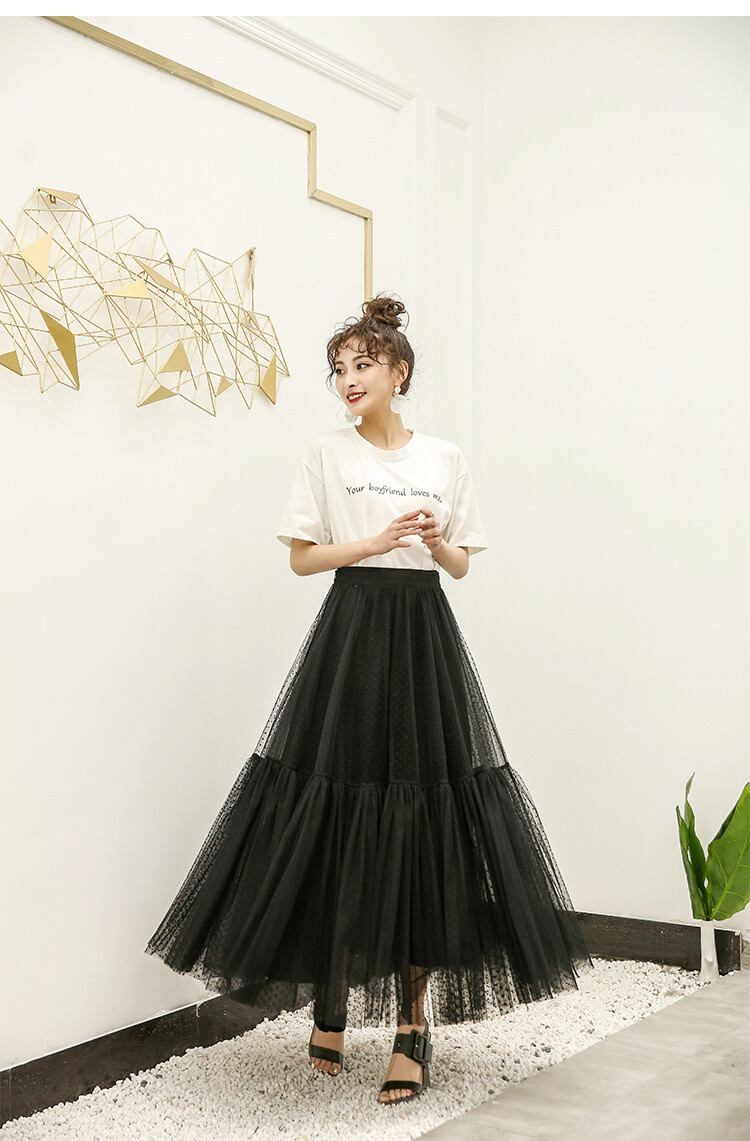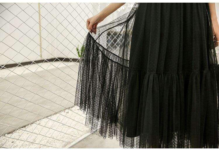 ◎【送料無料】レーヨン ロングスカート 2022年春の新作 ドット レース ハイウエスト 大きい裾