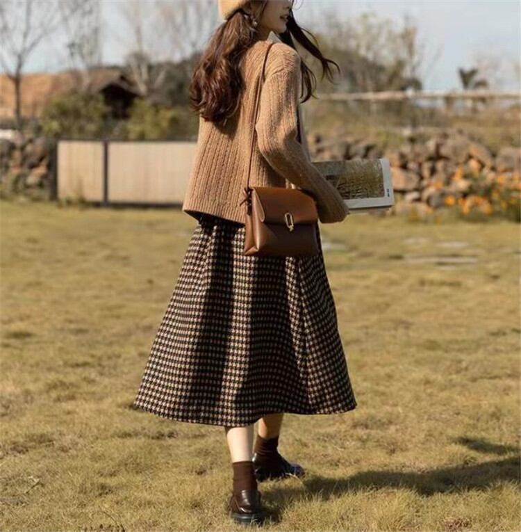 ◎【送料無料】中・長セクション ハイウエスト Aライン レディース 春 新作 千鳥格子 気質 スカート