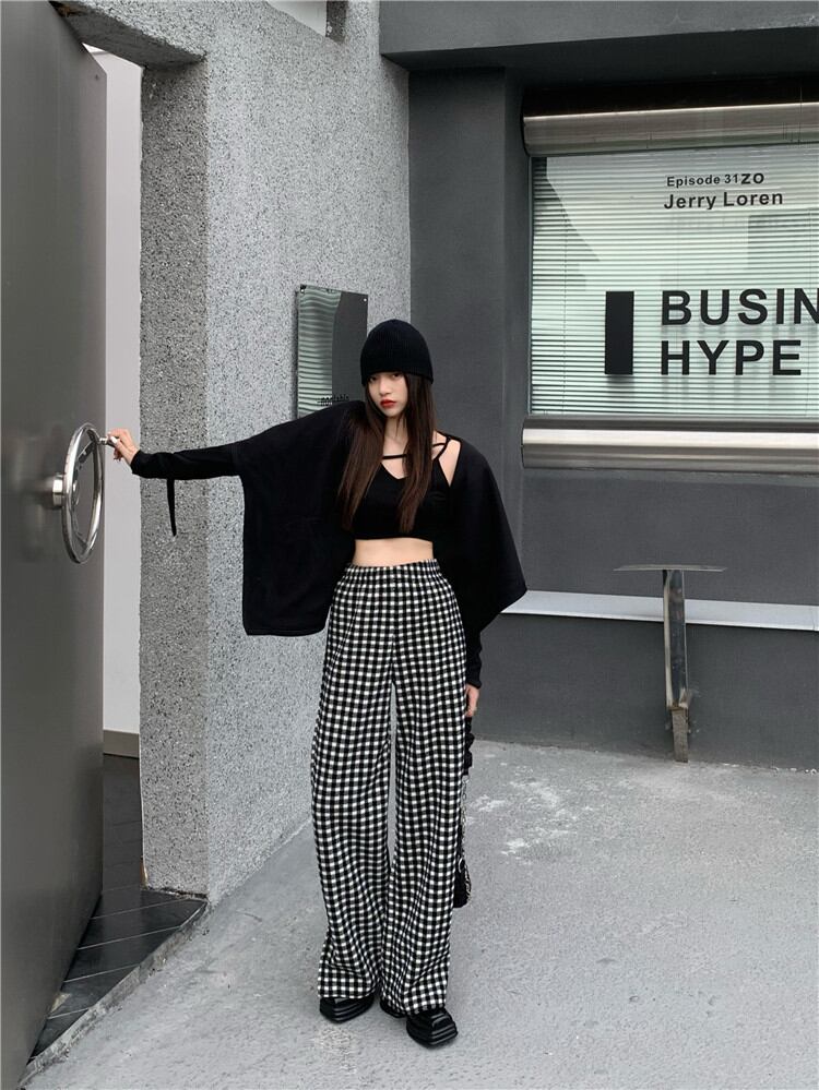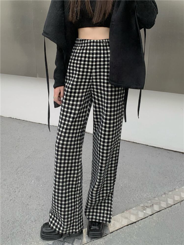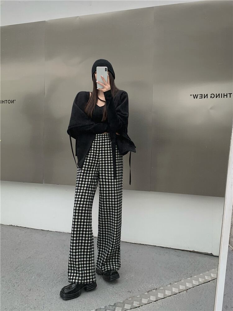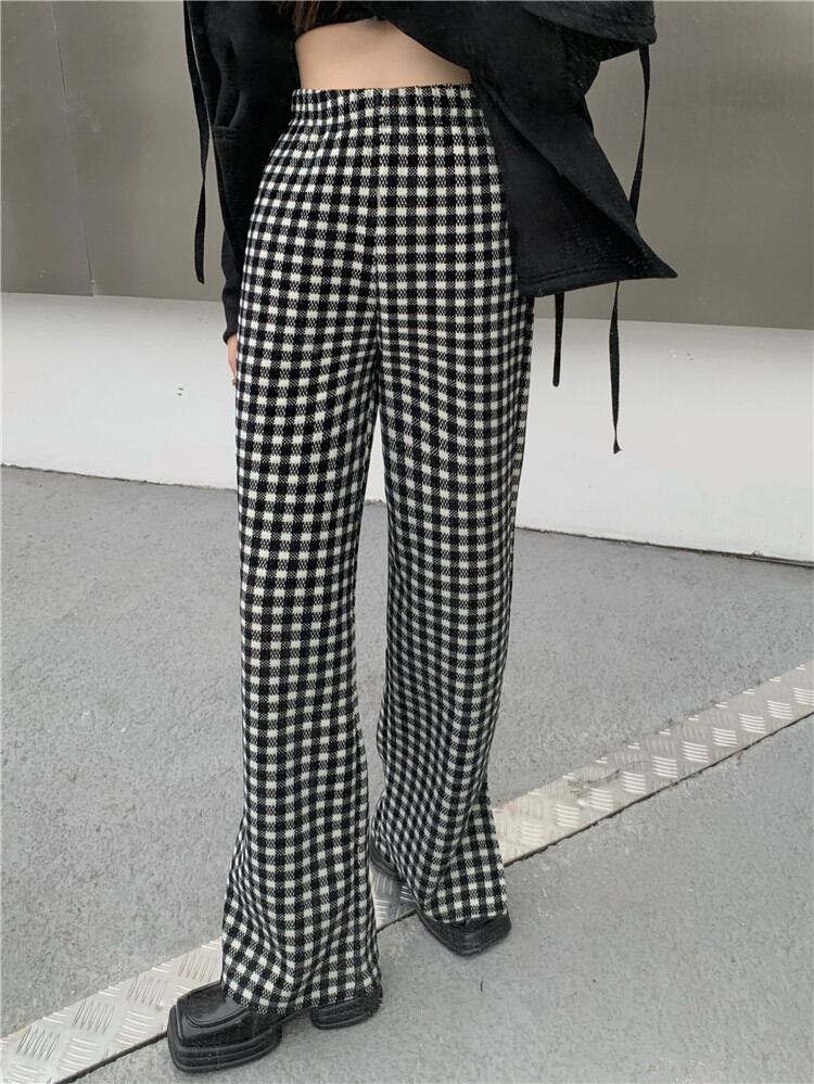 暖かい 厚手 スプリット ワイドパンツ ロングパンツ カジュアルパンツ チェック柄