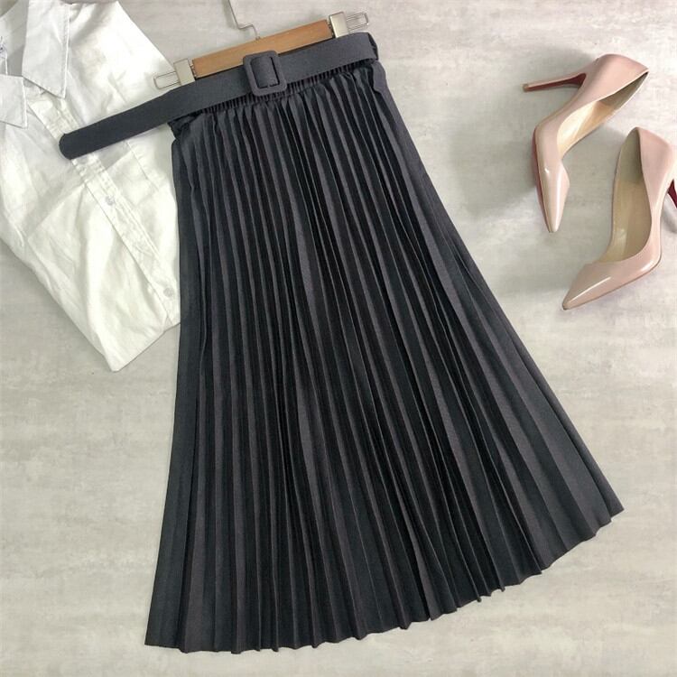 秋冬 ハイウエスト 大きい裾 ベルト付き プリーツスカート カジュアル Aライン