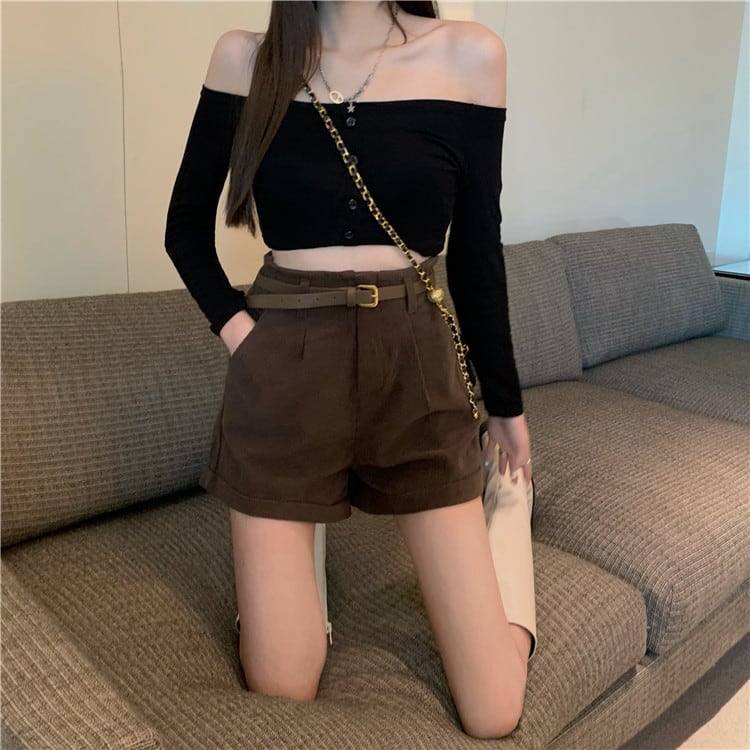 ハイウエスト コーデュロイ スリム ショートパンツ ベルト付き カジュアル