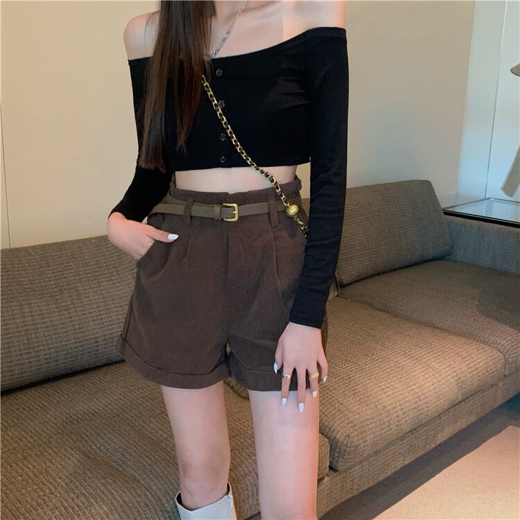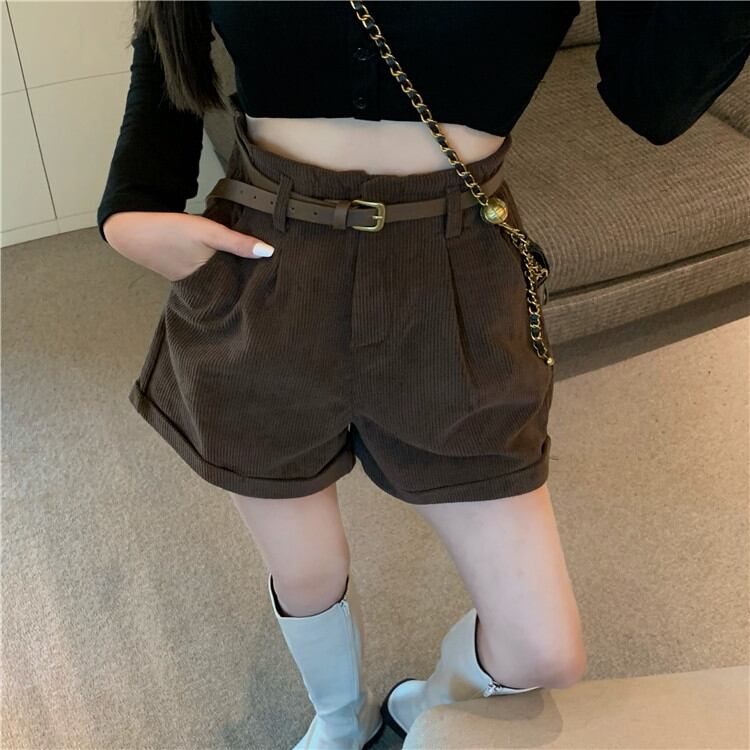 ◎【送料無料】カジュアルスタイルを旬に変える レトロ ハイウエスト コーデュロイ スリム ショートパンツ ベルト付き