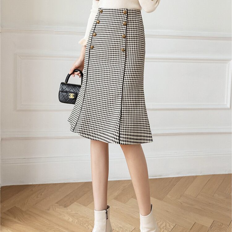 ◎【送料無料】フィッシュテールスカート OL シンプル 2021年秋冬新作 レトロ フリル 格子縞