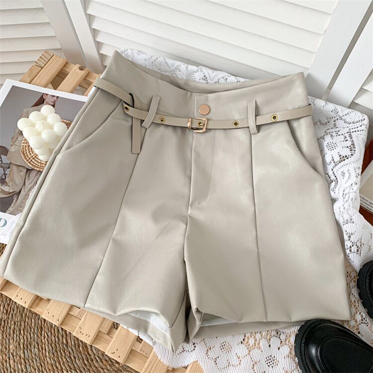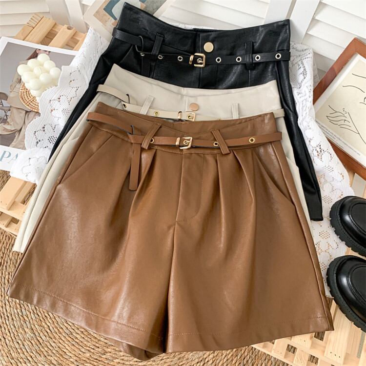 ◎【送料無料】ハイウエスト ショートパンツ 2021年秋冬新作 PUレザー フォールド ベルト付き