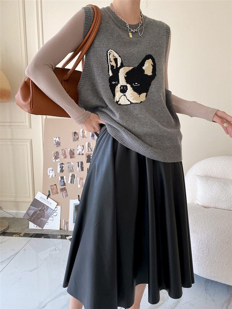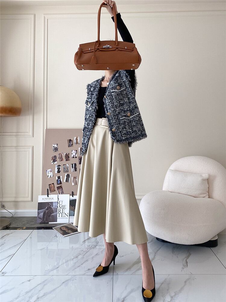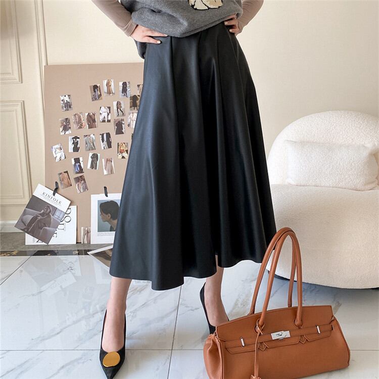 ◎【送料無料】2021年秋冬新作 Aライン ハイウエスト 中・長セクション 大きい裾 PUレザースカート
