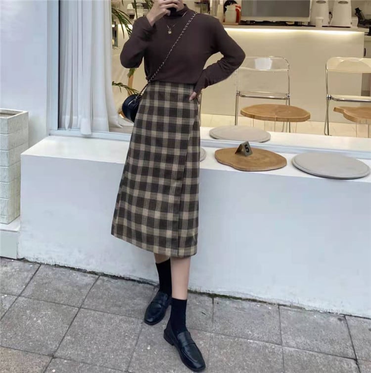 中・長セクション タイトスカート レトロ スプリット チェック柄 スカート