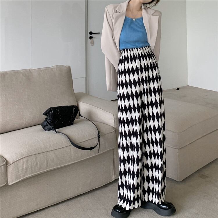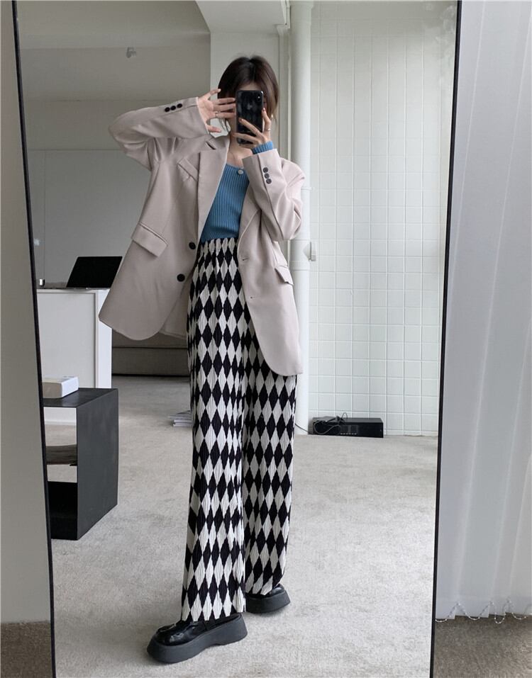 チェック柄 カジュアルパンツ 秋 ロングパンツ ハイウエスト ゆったりする ワイドパンツ