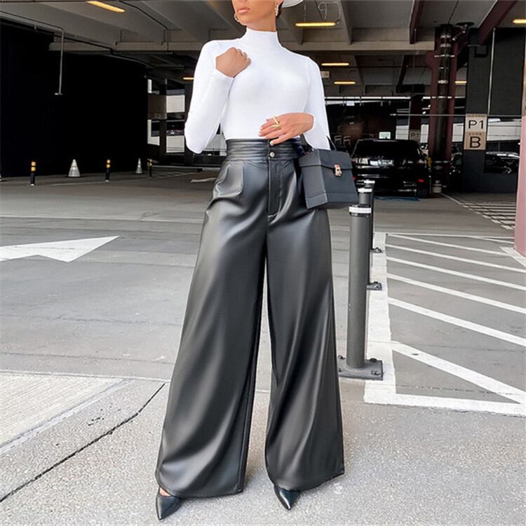 ◎【送料無料】ワイドパンツ PUレザーパンツ 2021年秋冬新作 無地 セクシー ハイウエスト