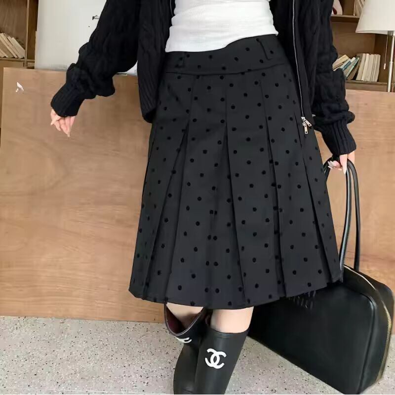 【送料無料◎】 厚みのあるハイウエストAラインスカート レディース 秋冬 水玉プリーツ ミドル丈 ハーフボディスカート 韓国風 通勤