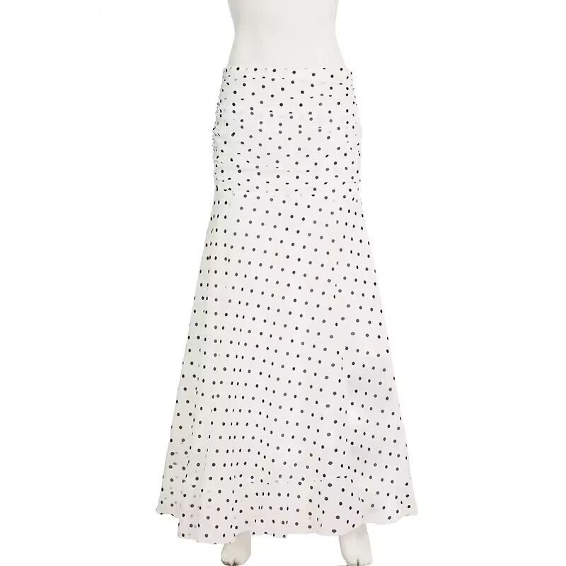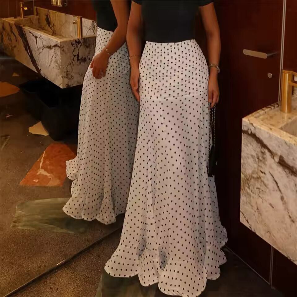 【送料無料◎】 Hirigin 水玉模様フロアレングスシフォンスカートフレンチスタイルフリルメッシュ A ラインスカートエレガントマキシボトムスハイウエストストリート