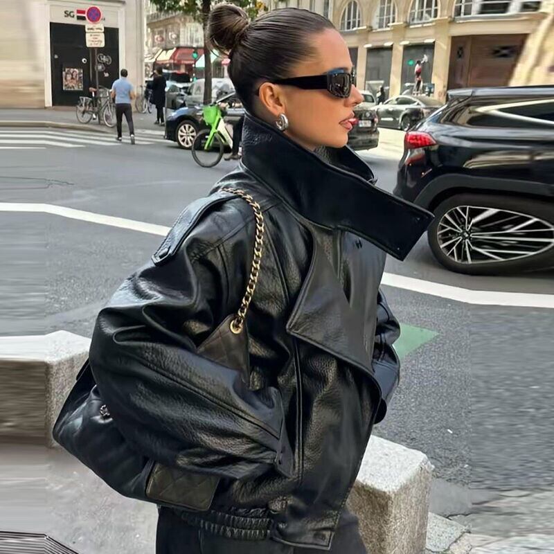 【送料無料◎】 HXAO フェイクレザー黒ジャケット女性のための新着クロップドオーバーサイズボンバージャケットジップアップ長袖コートオートバイジャケット