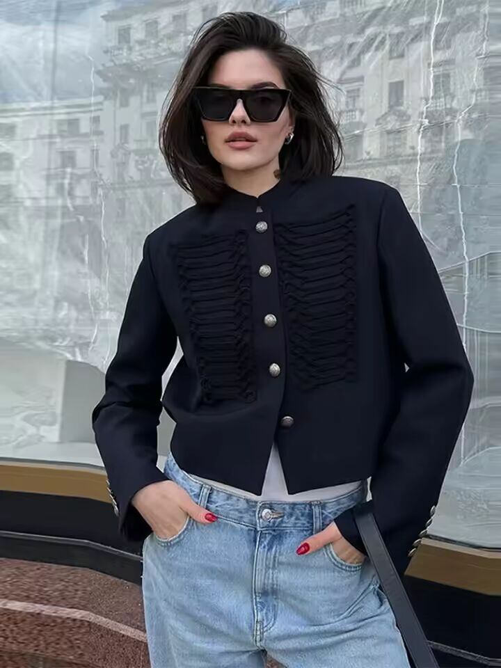 【送料無料◎】 女性のナポレオンスタイルブラッククロップドジャケットコート長袖トップス編組ボタントリムヴィンテージスリムフィットファッションレディースアウターウェア