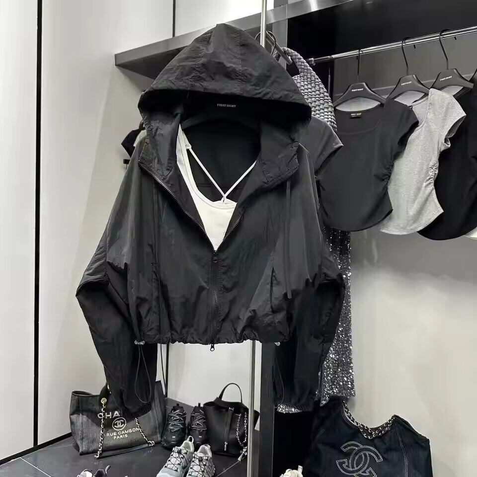 【送料無料◎】 3 色ジャケット女性の夏の作物レジャー日焼け止めフード付き薄型ルーズヴィンテージ純粋な基本的なアウターハイストリートカレッジファッション