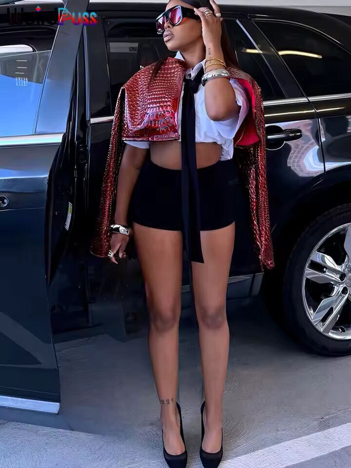 【送料無料◎】 奇妙な小娘フェイクレザークロップジャケット女性ヒップスター秋トレンドスネークプリント O ネックフルスリーブストリートワイルドベーシック生き抜くコート
