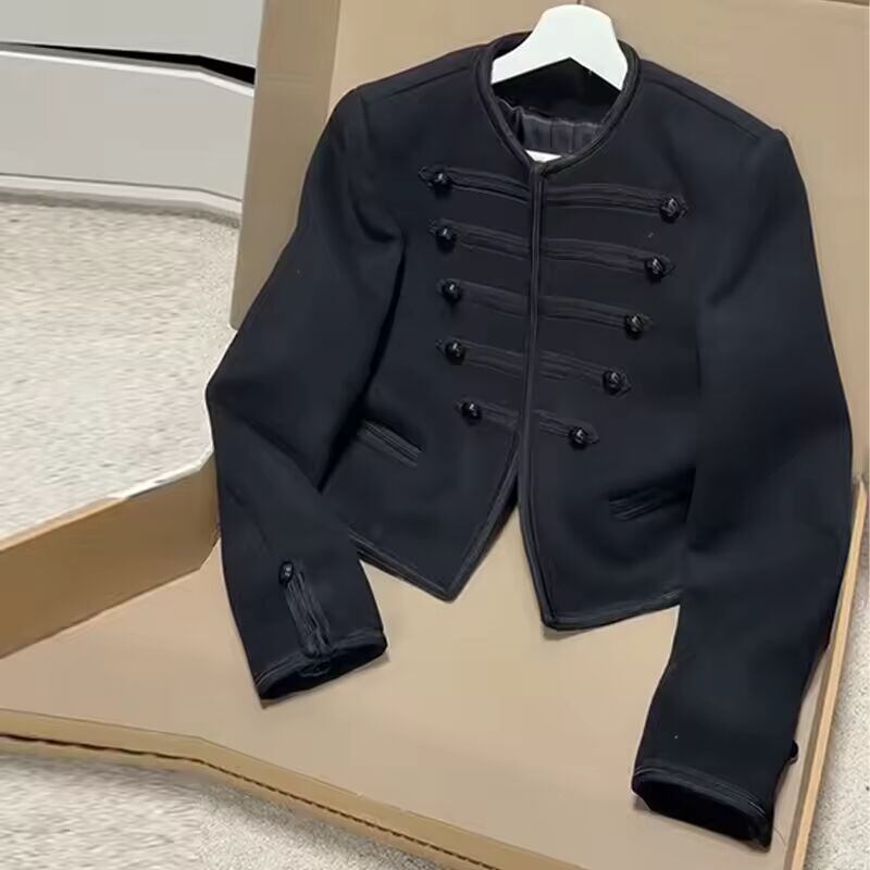 【送料無料◎】 ファッションブラックコートスタイルクロップドジャケット レディース エレガントOネック長袖ダブルブレストコート レディー2026春シックアウター
