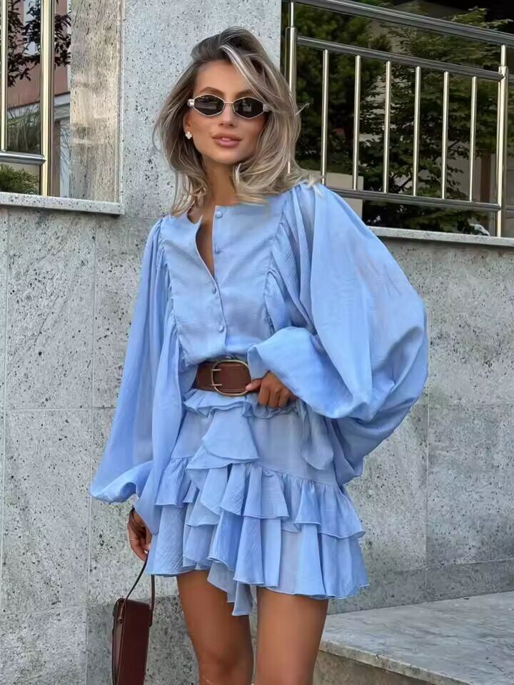【送料無料◎】 2025 夏の女性のシックなミニドレスシングルブレストレイヤードフリル O ネックランタンスリーブパーティードレスエレガントな女性ショート Vestido