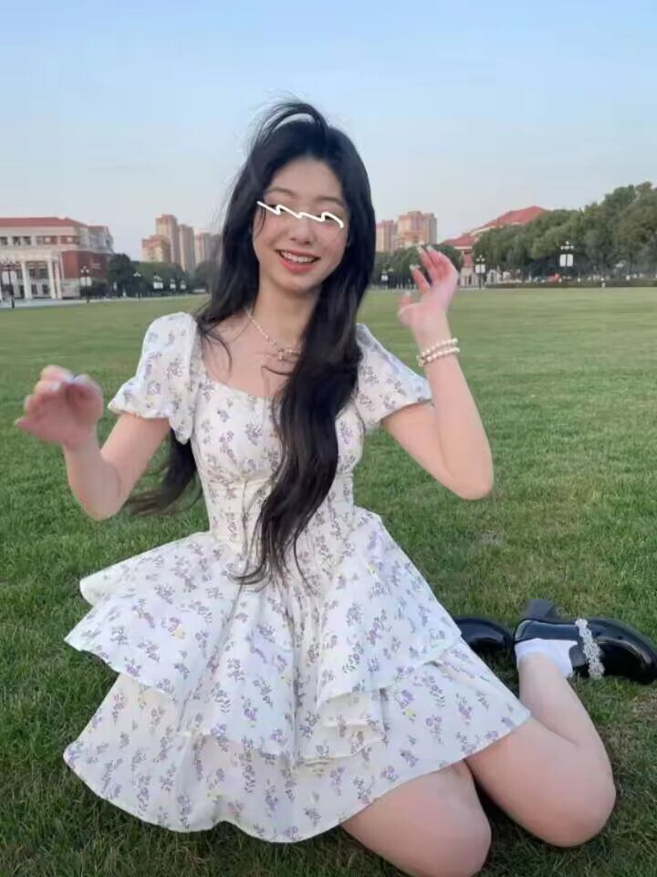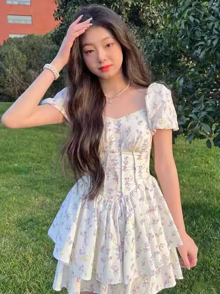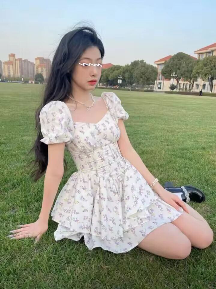 【送料無料◎】 女性のためのハイウエストドレス,花柄,愛らしい,スクエアカラー,パフスリーブ,プリンセスガーリッシュ,柔らかく,エレガントな韓国スタイル,プレッピーシック,夏