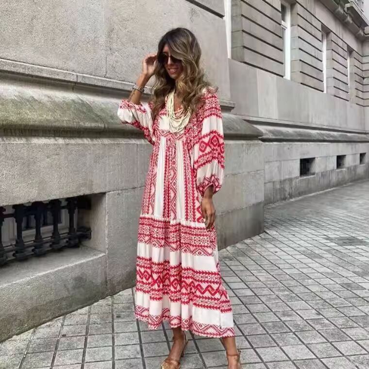 【送料無料◎】 パフスリーブ,ボヘミアンスタイル,レトロ,マキシ,フローラルプリント,カジュアル,Vネック,ルーズ,レディース,バケーション,ビーチ,パーティー