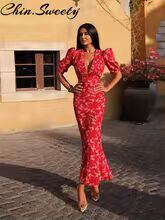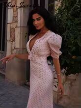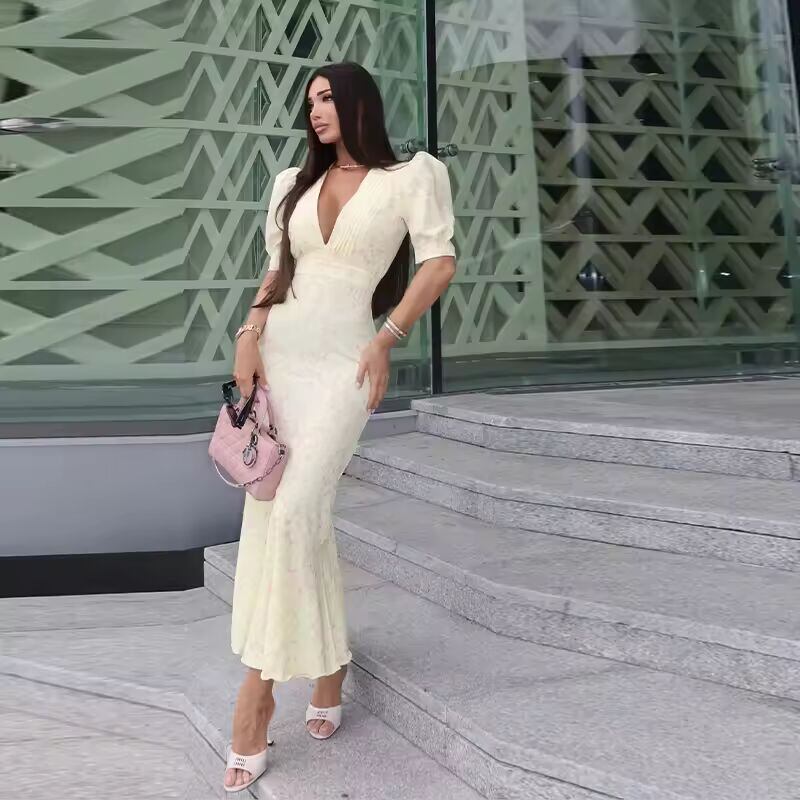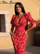 【送料無料◎】 セクシーなパッチワークプリントのレディースドレス、ファッショナブルなVネック、ショートパフスリーブ、ヒップパッケージ、女性用ドレス、2025年夏、都会的な女性用ローブ