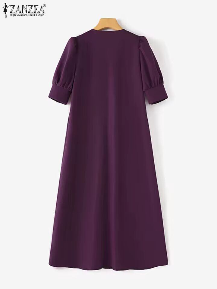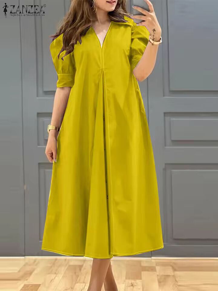 【送料無料◎】 ZANZEA ファッション V ネックプリーツドレス女性ソリッドパフ半袖ミディドレス 2024 夏エレガントなストリートルーズドレス特大