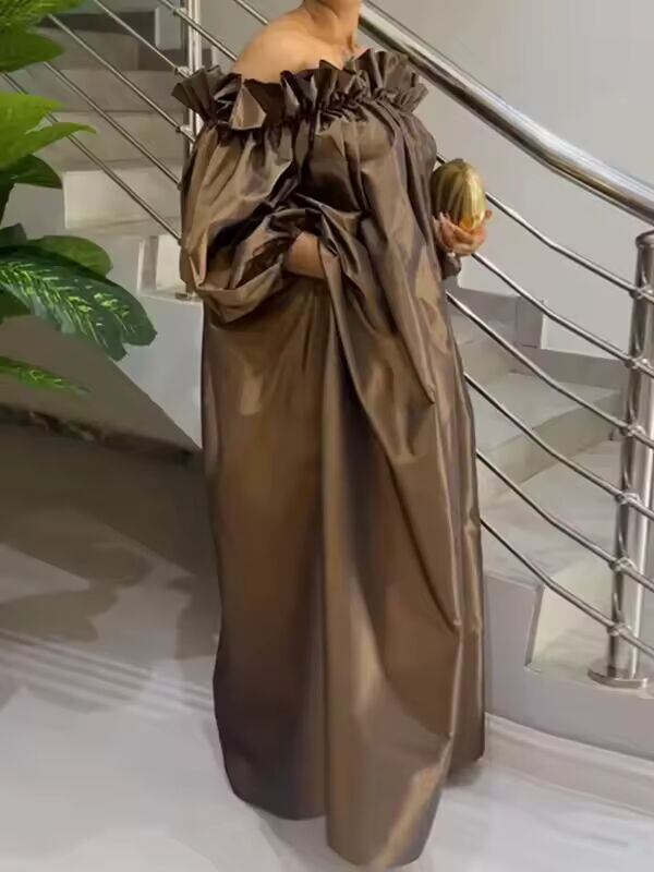 【送料無料◎】 女性ファッションファルバラエレガントなイブニングマキシドレス春の新作パフスリーブプリーツオフショルダーパーティーウエディングドレス