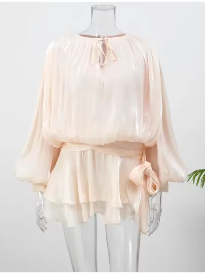 【送料無料◎】 光沢のあるガーゼの無地のレイヤードフリルAラインミニドレス、女性用エレガントなOネックランタンロングスリーブ、シックなレディパーティガウン
