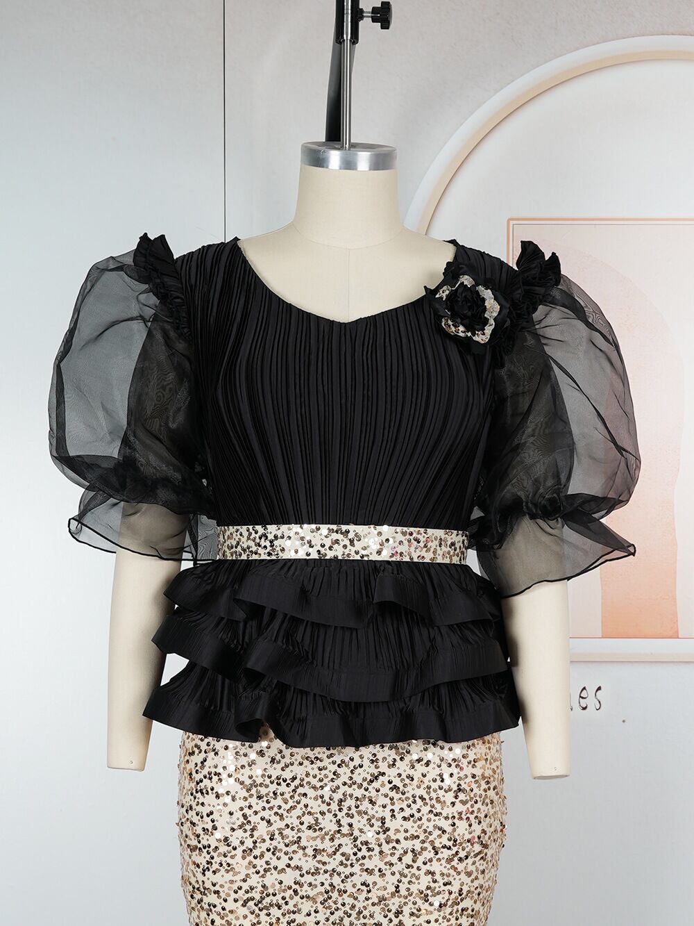 ふんわりとしたパフスリーブワンピースのデザインは、肩回りを華奢に見せつつ、顔周りをパッと明るい印象に。ジャガード織りやオーガンザなど、贅沢な素材感が動くたびに美しい余韻を残します。