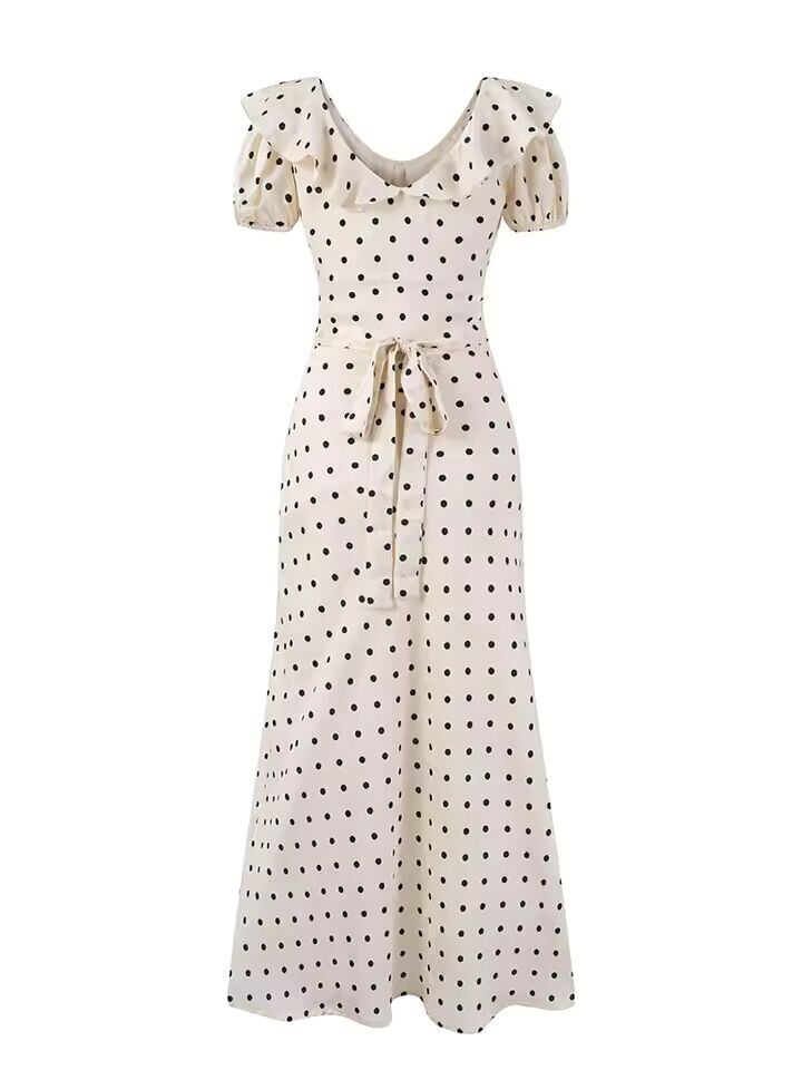 【送料無料◎】 チューサウビューティー レディース 新ファッション スウィート ポルカドット柄 シックなフリル ミディ丈ワンピース フレンチVネック パフスリーブ ヴィンテージ パーティードレス