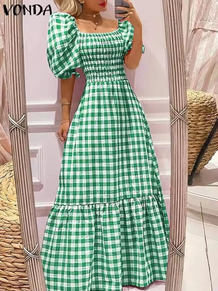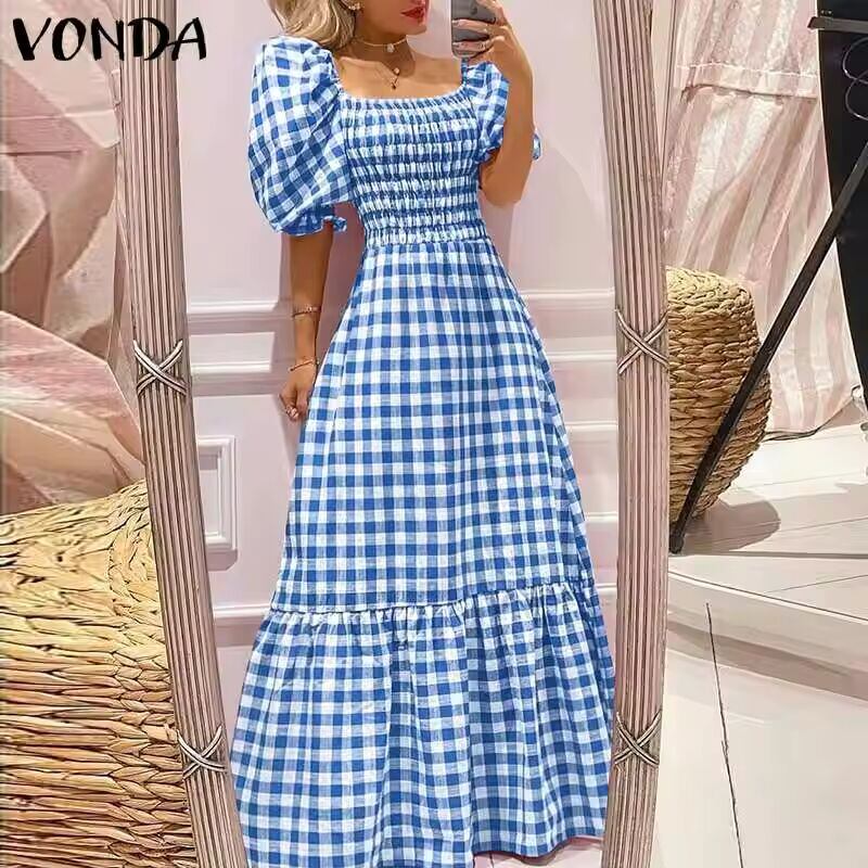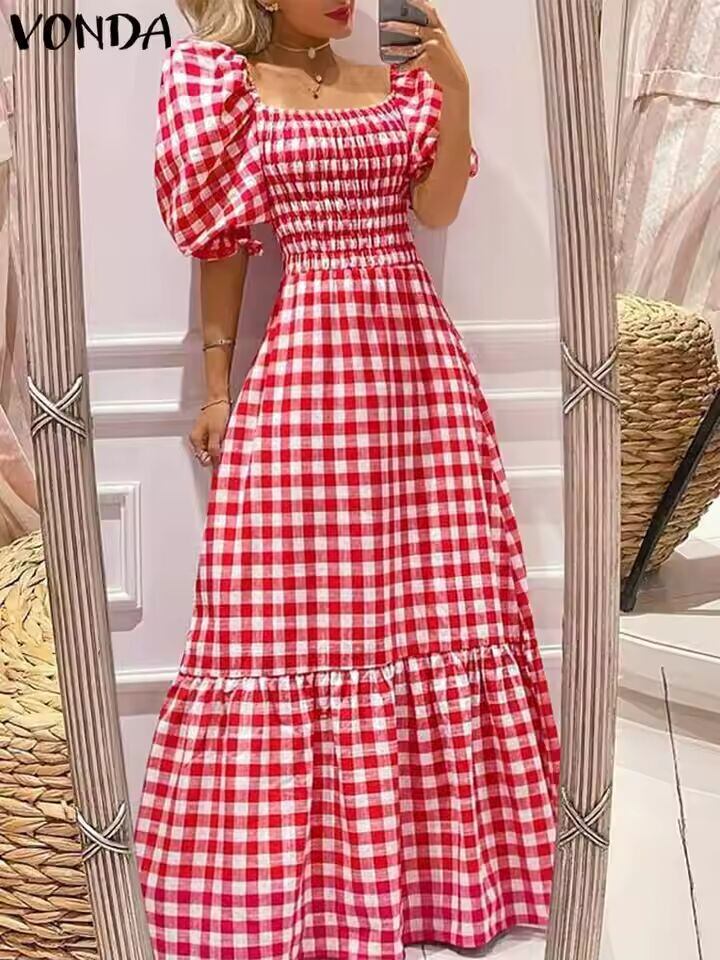 【送料無料◎】 Vonda-女性のボヘミアンロングドレス,サマードレス,半袖,パフスリーブ,チェック,カジュアル,セクシー,スクエアカラー,パーティードレス,2023