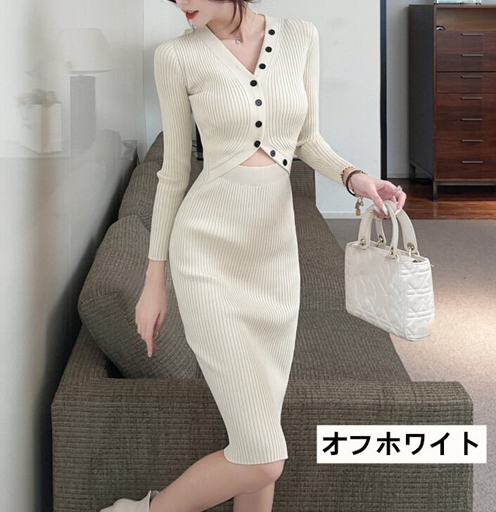 ◎【送料無料】タイト ニット ワンピース 長袖 ミディアム丈ワンピース パーティードレス リブニット Vネック ワンピ