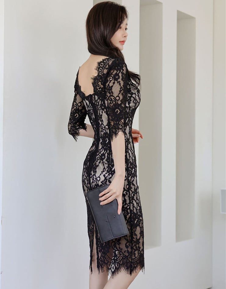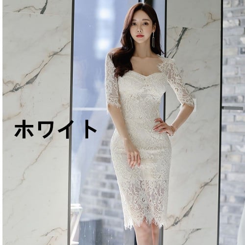 女性らしいスリムなシルエットが魅力的なレースドレスです。