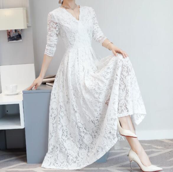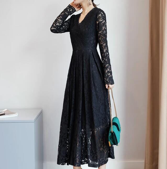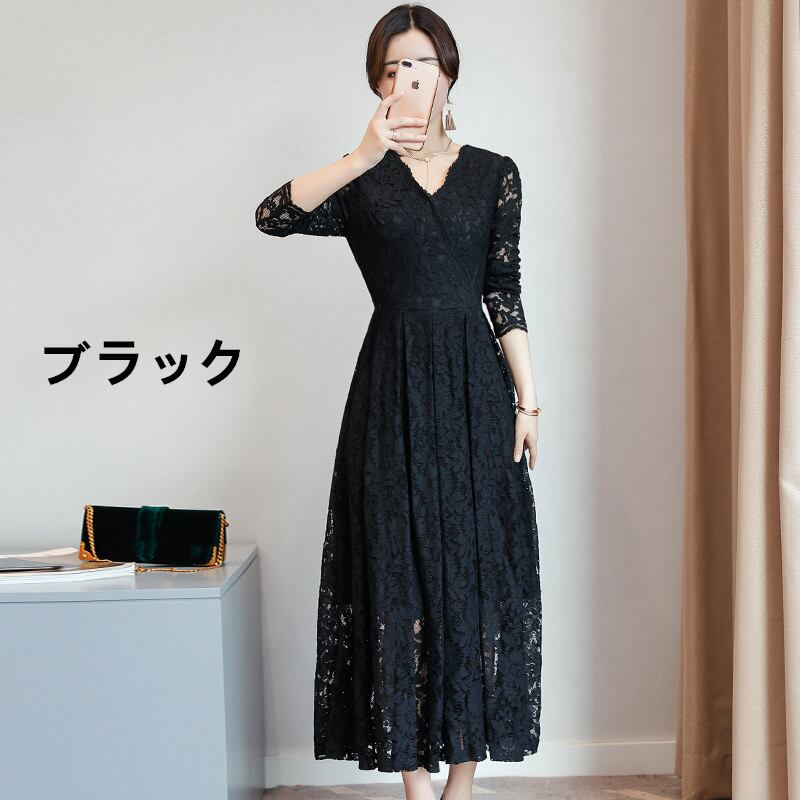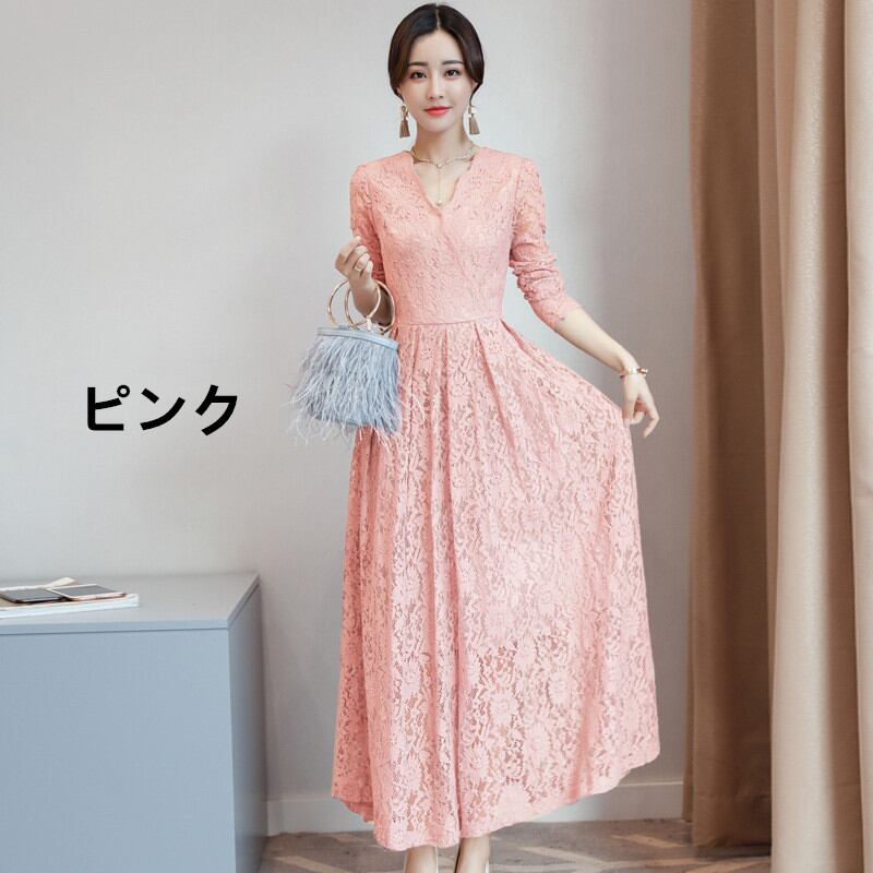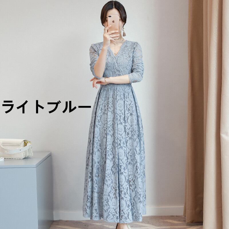 ◎【送料無料】レース ワンピース 長袖 パーティードレス 結婚式 Vネック 体型カバー 20代 二次会 aライン ロングワンピ