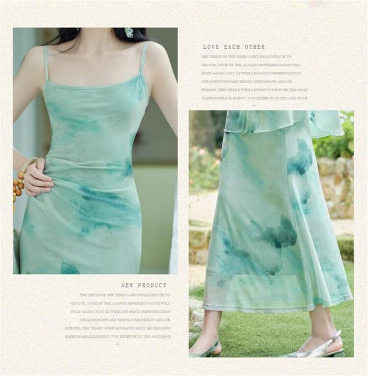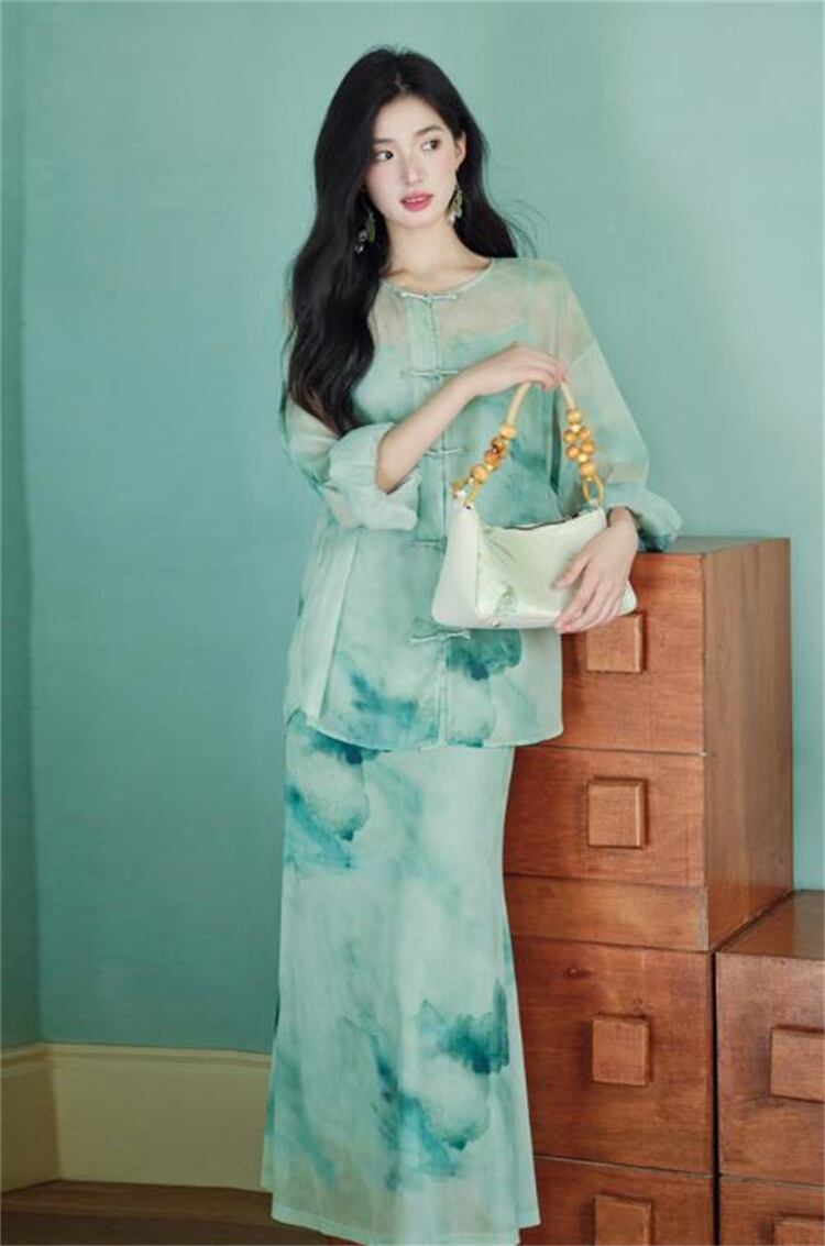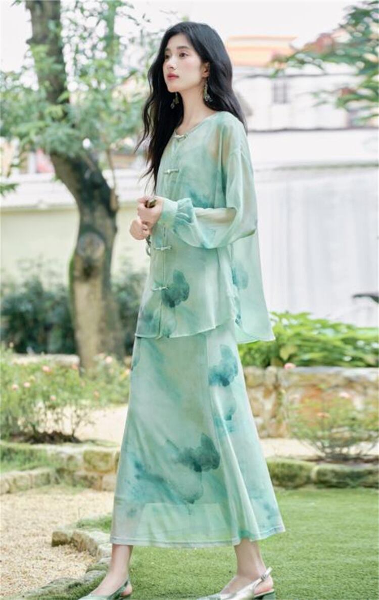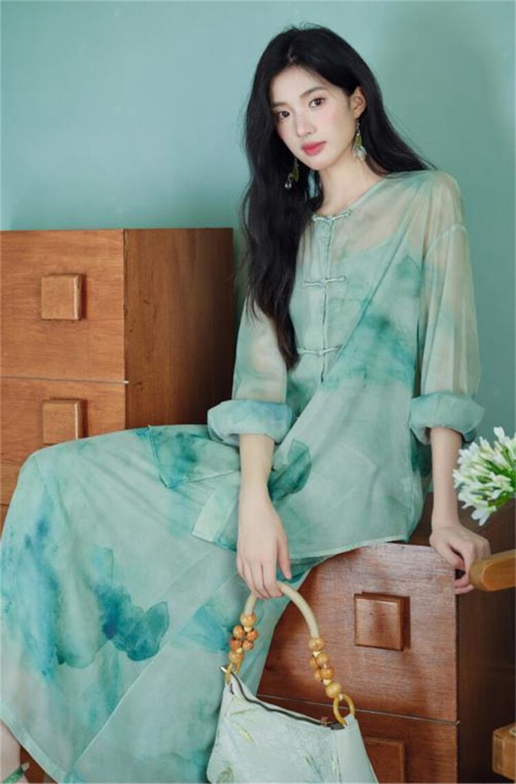 ◎【送料無料】チャイナボタン付きカーディガン 墨絵風 チュール長袖トップス キャミワンピース 2026年春秋 2ピースセット