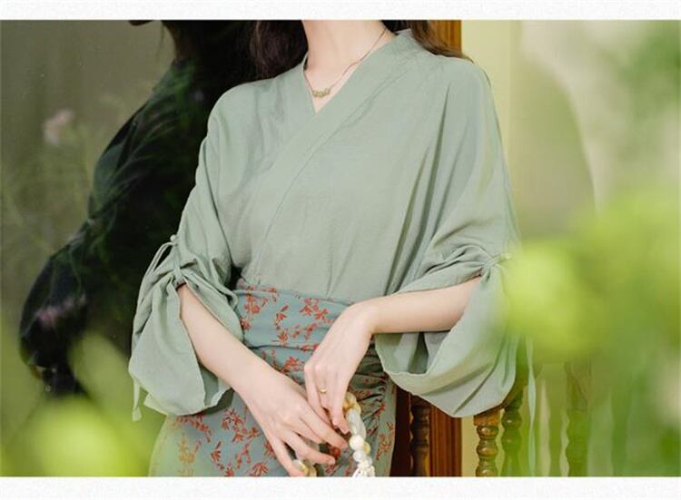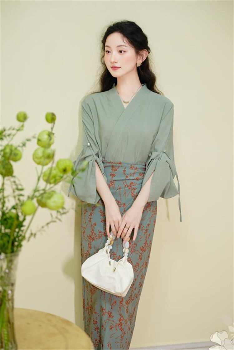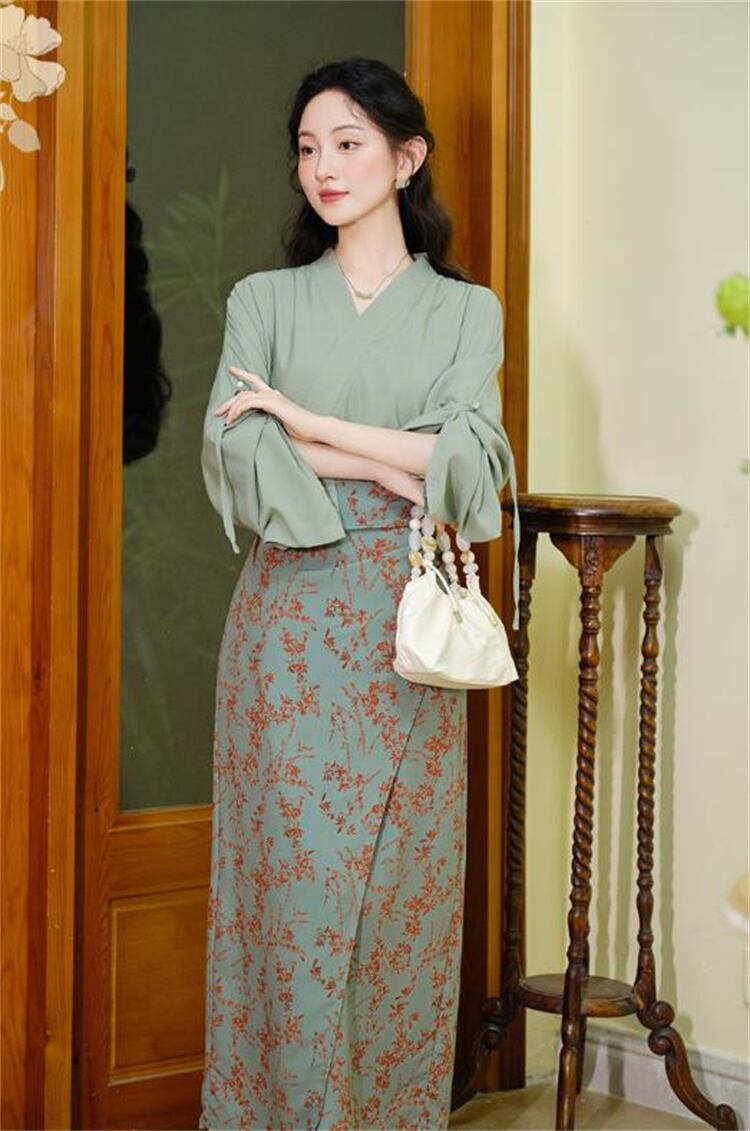 着心地の良い 2026 年モデル セットアップ グリーン Vネック長袖トップス タイトスカート ソフトな雰囲気