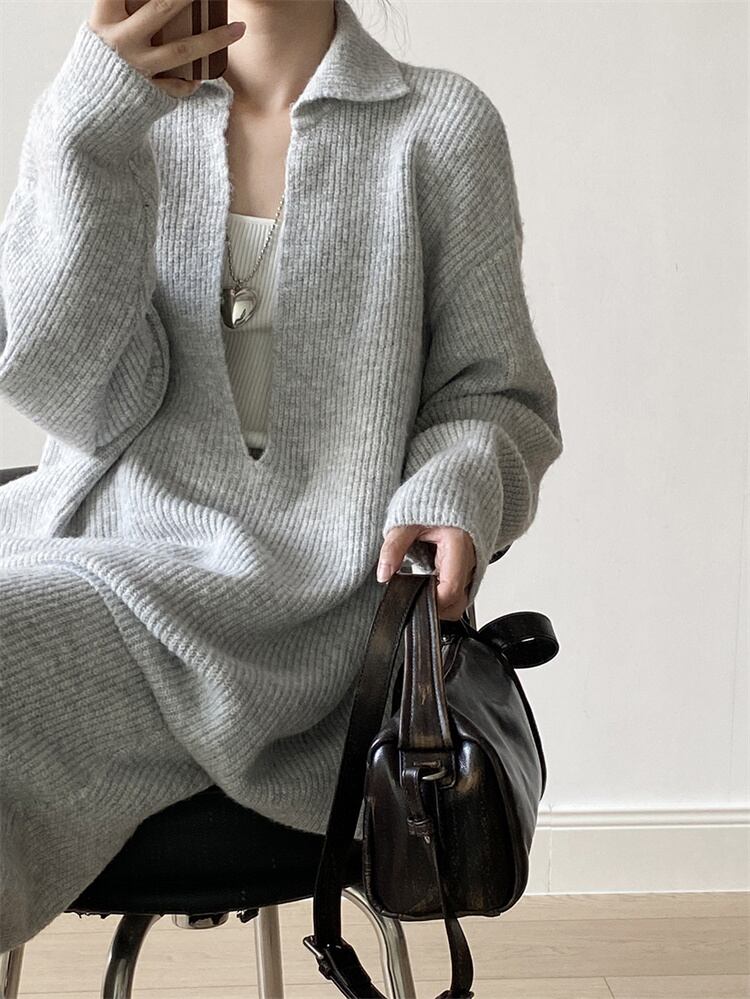 深Vネック ゆったりセーター ハイウエストニットロングスカートセット 2025秋 カジュアルコーーデ
