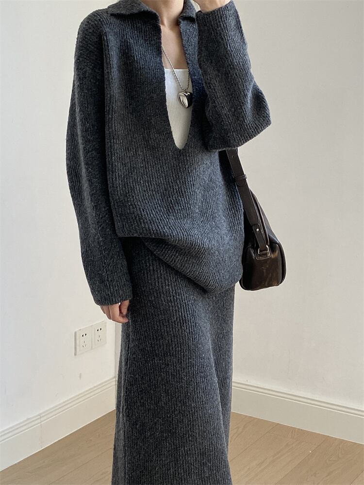 ◎【送料無料】深Vネック ゆったりセーター ハイウエストニットロングスカートセット 2025秋 カジュアルコーーデ