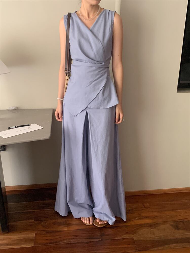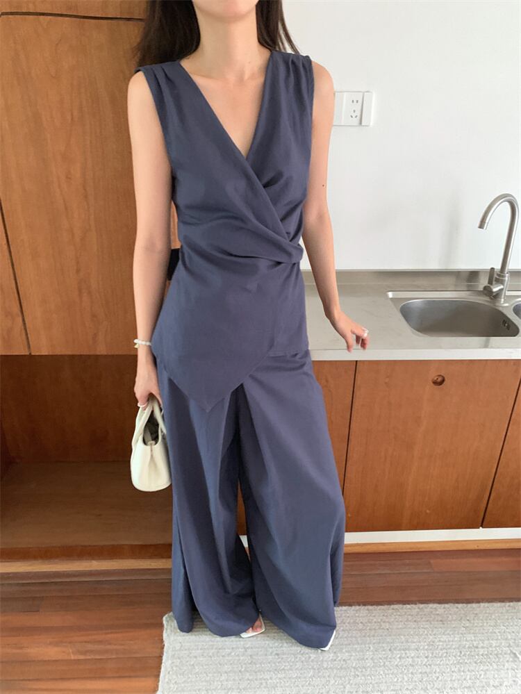 ◎【送料無料】無袖クロスストラップデザイントップスとゆったりハイウエストパンツのカジュアルコーデ 2カラー展開
