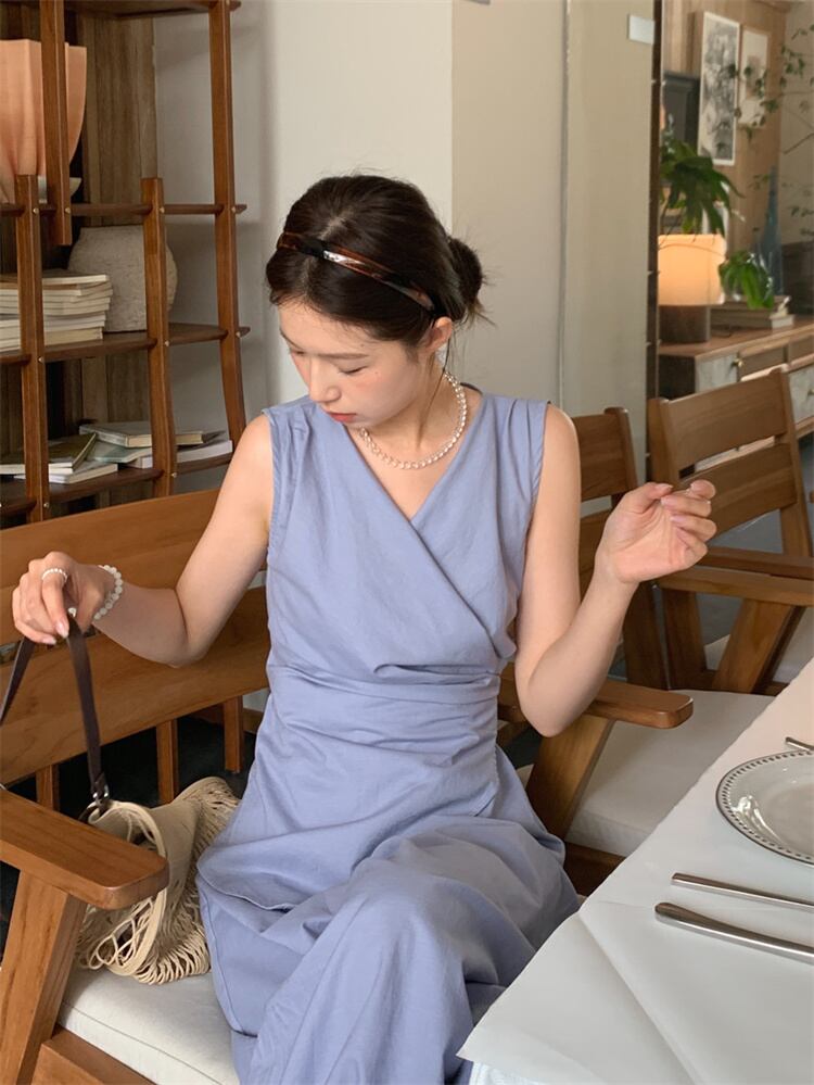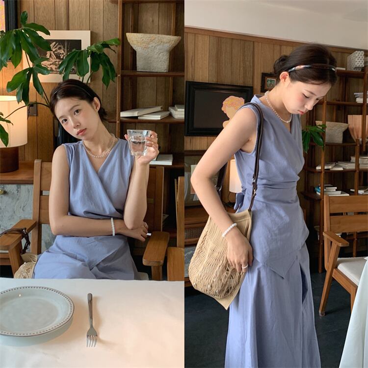 無袖クロスストラップデザイントップスとゆったりハイウエストパンツのカジュアルコーデ 2カラー展開