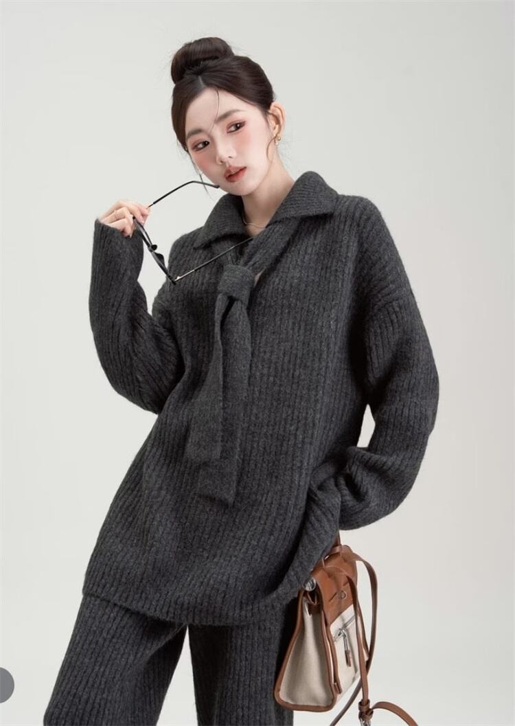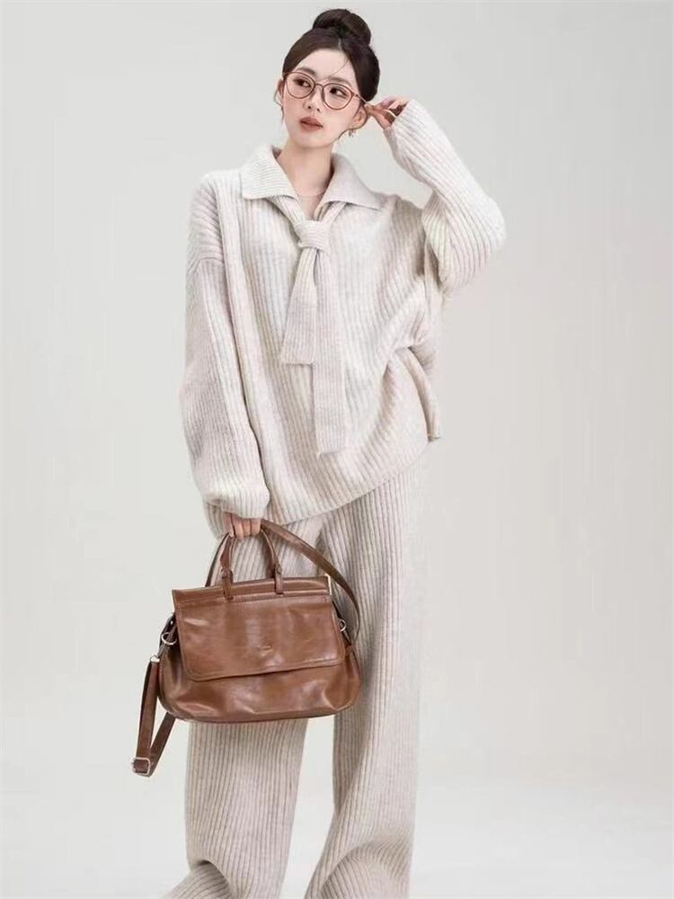 ◎【送料無料】秋冬 おしゃれ着こなし 厚手ニット カジュアル ハイウエストパンツ セット