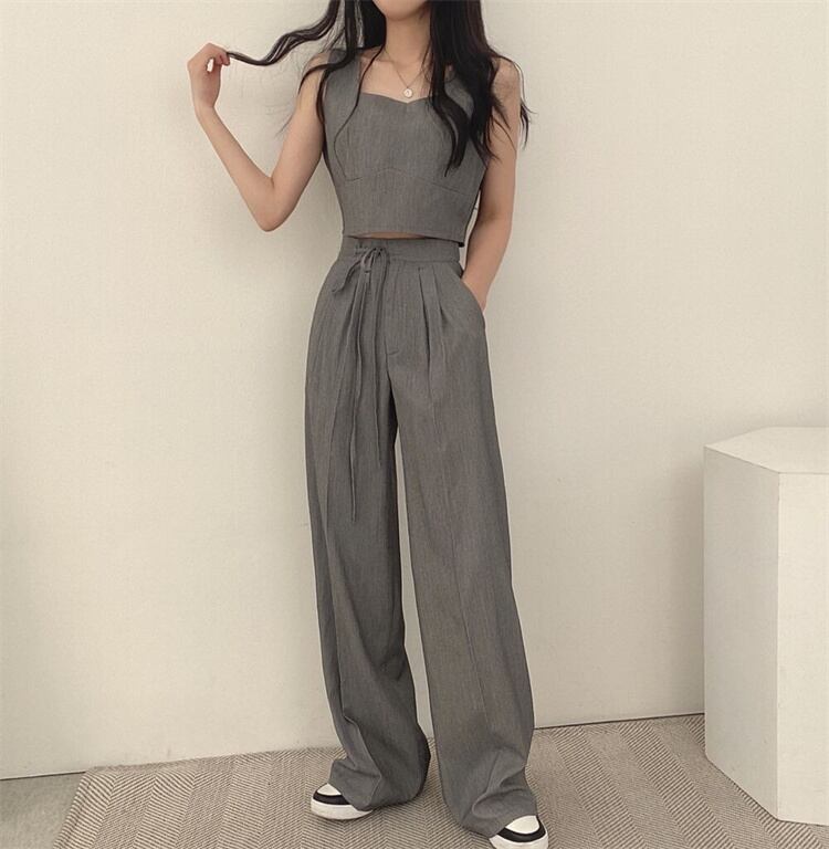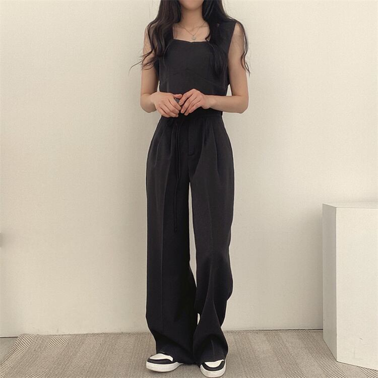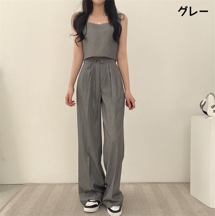 夏季コーデセット 角形カラーノースリーブ 裾上げベスト+腰紐付きロングパンツ