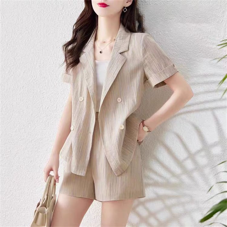 ◎【送料無料】2025夏 新作 ビジネスタイプ スーツネックシャツ3点セット 夏用オフィスカジュアル 短パン組み合わせ