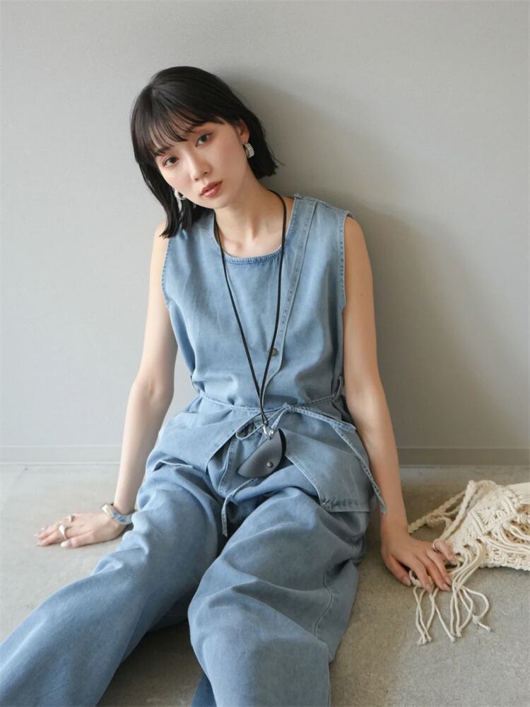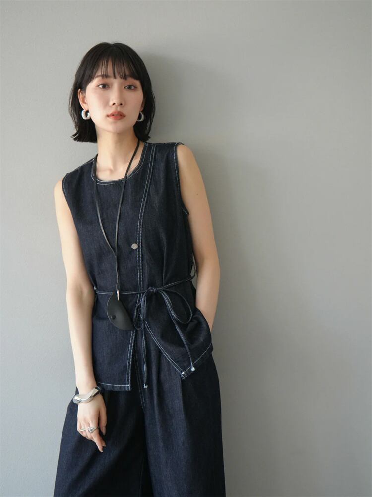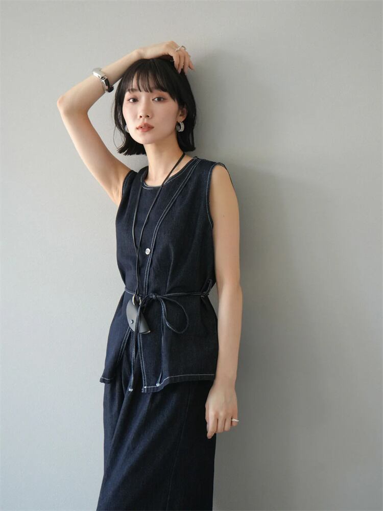 スリムデニムセットアップ ノースリーブトップス+デニムパンツ 2点組