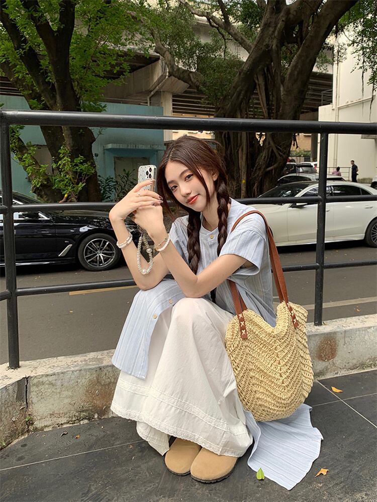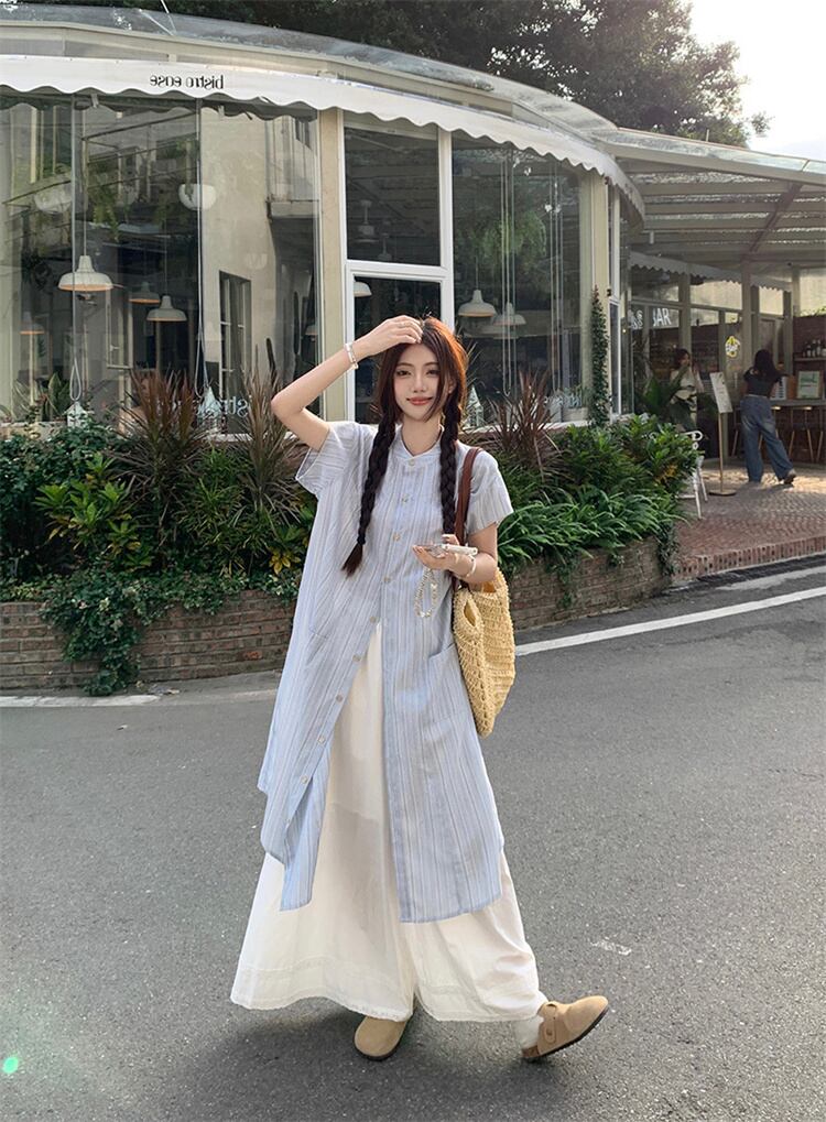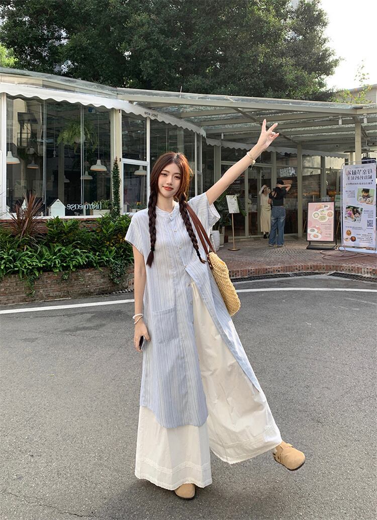 ストライプシャツワンピ×ワイドパンツ 2点セット 夏物ロング丈 通気性快適