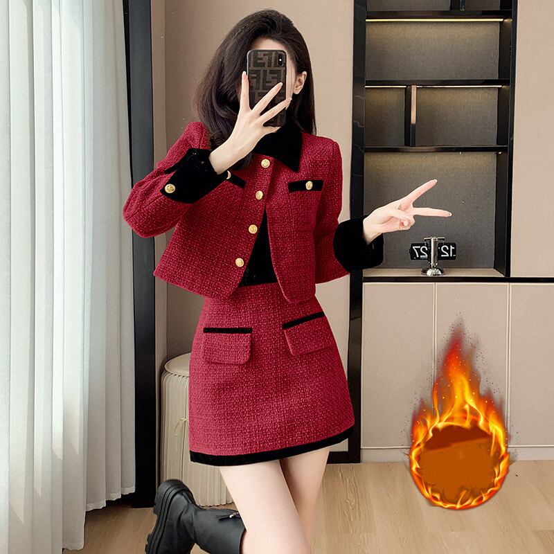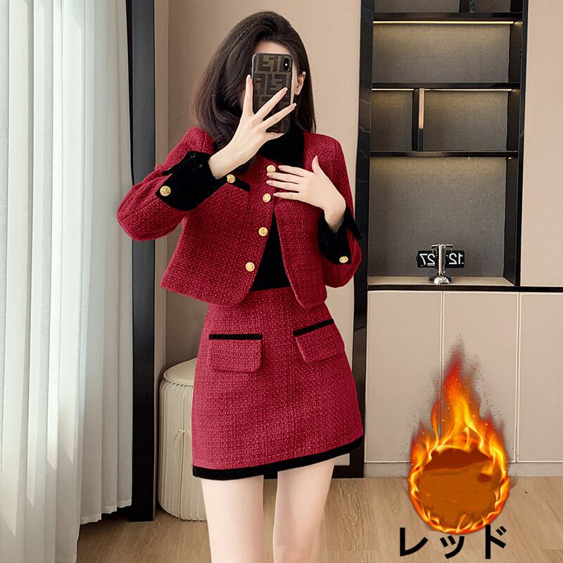 ◎【送料無料】厚手 ツイード スーツ ショート丈 ノーカラージャケット 裏綿入り フォーマルスーツ キャバスーツ タイト