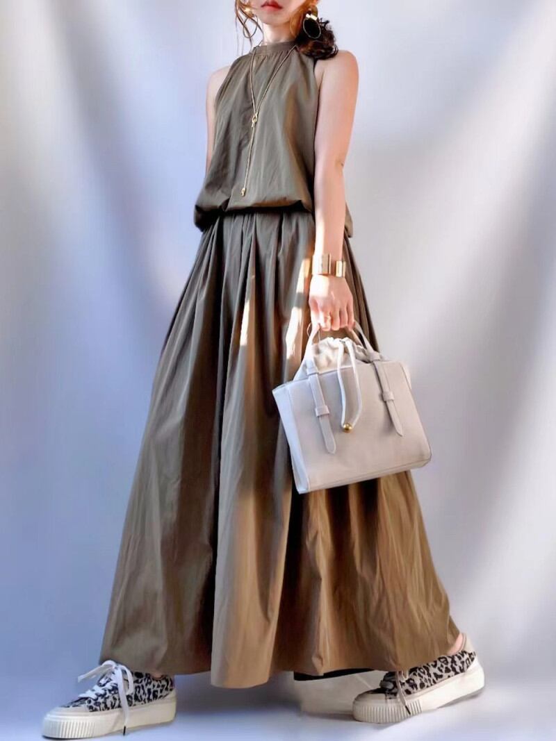 オシャレなノースリーブトップス+ロングスカートセットアップが登場。