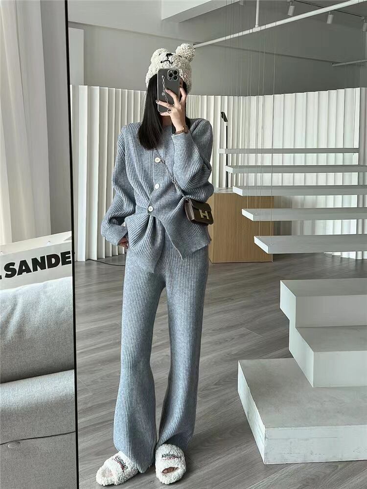 ◎【送料無料】韓国 トップス 長袖 ニットセーター ワイドパンツ 2点セット 体型カバー エレガント 厚手 レディース