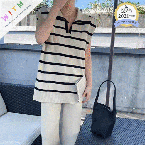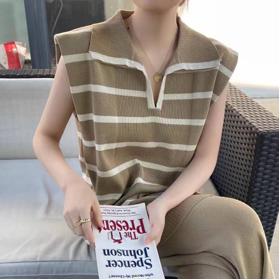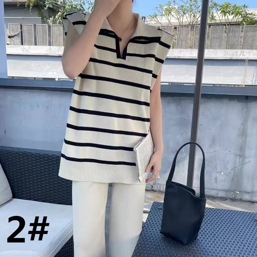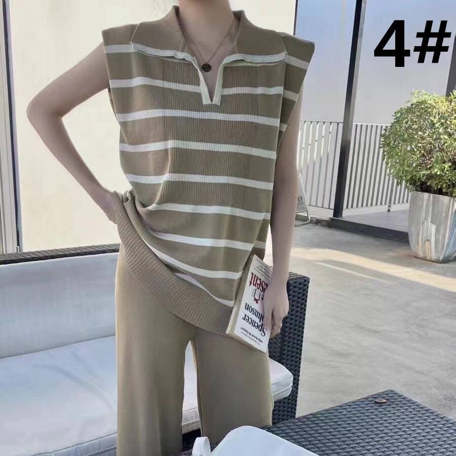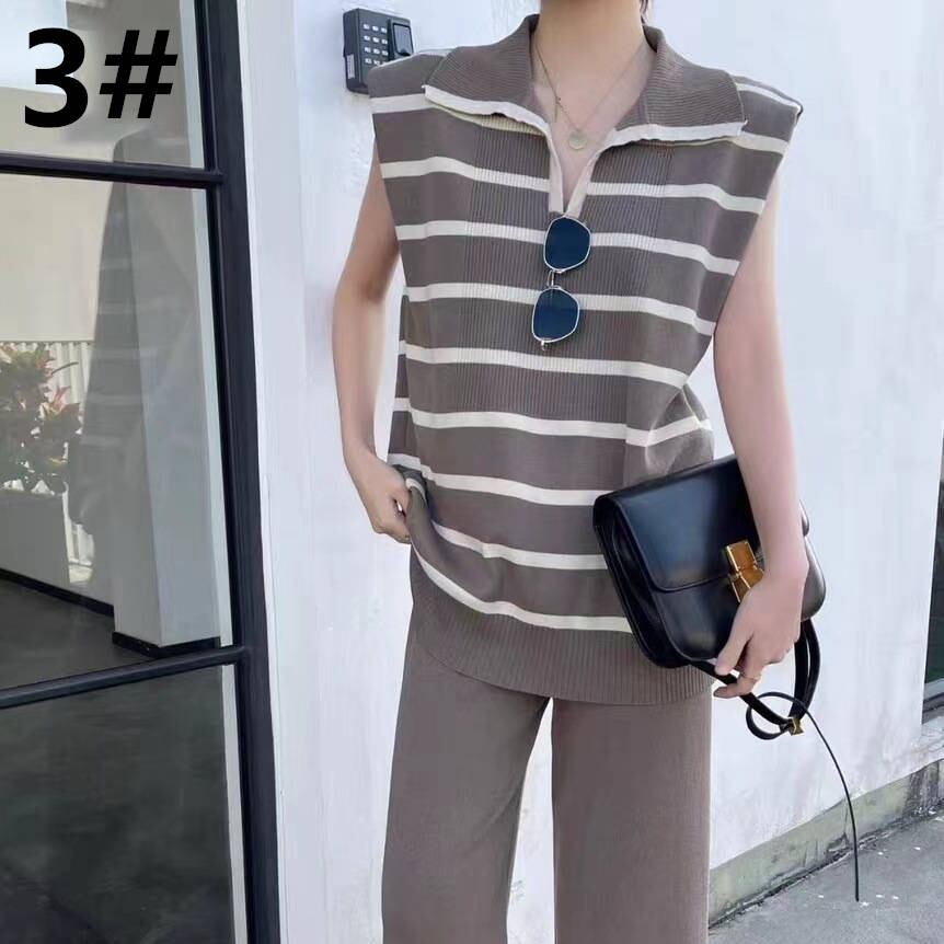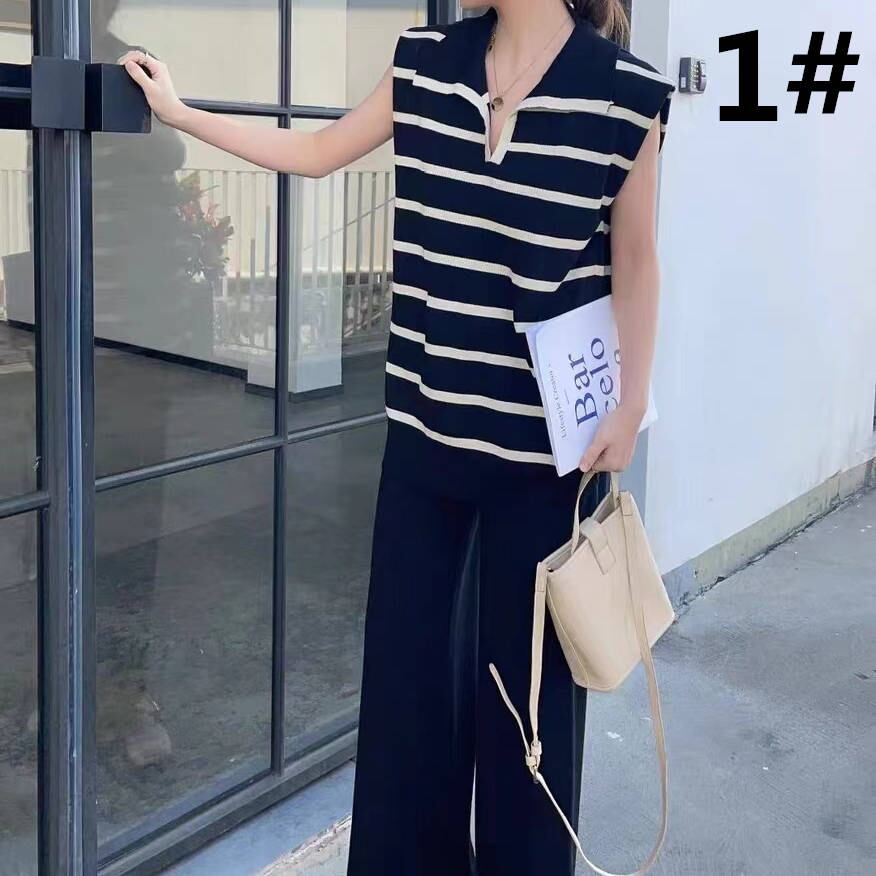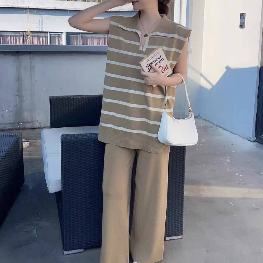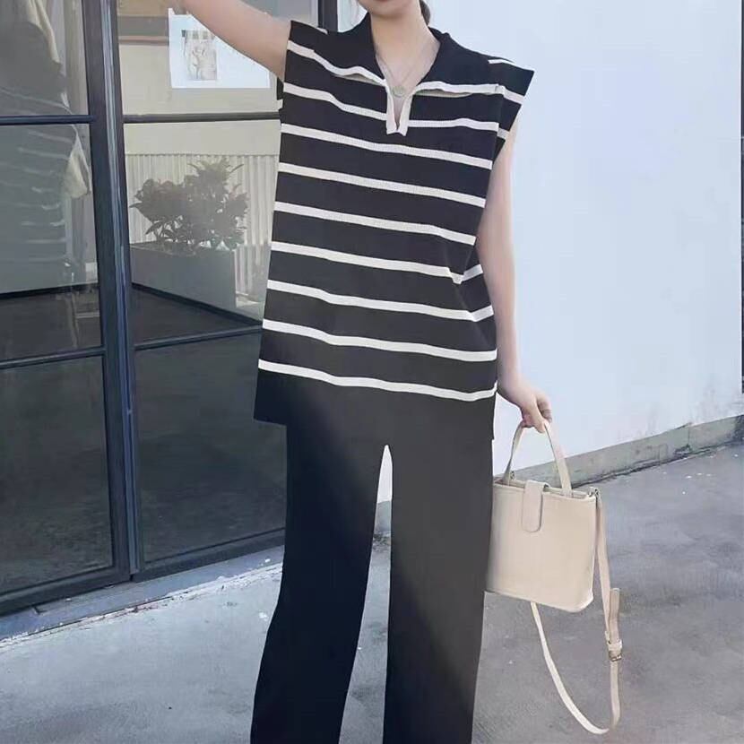 ◎【送料無料】2023春夏新作 トップス ストラップ柄 ニットベスト ロングパンツ 袖なしベスト 2点セット
